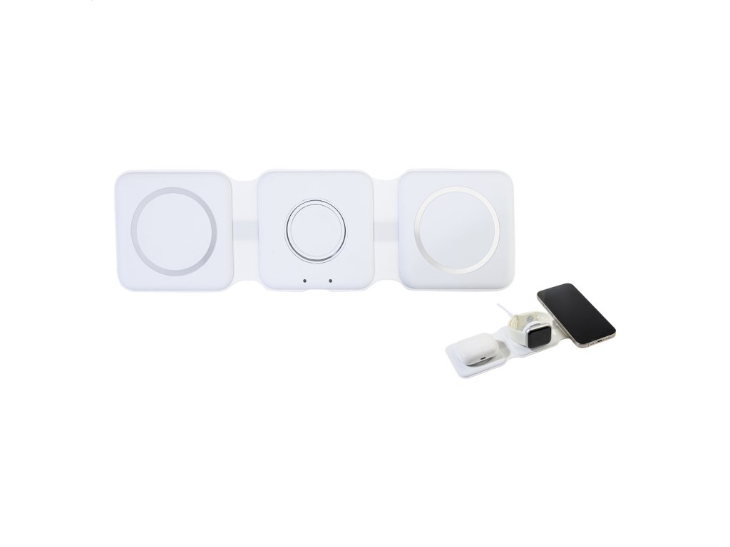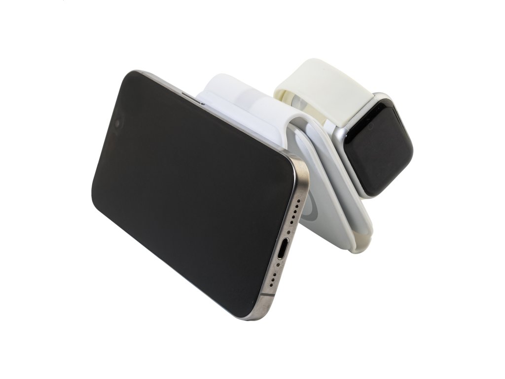 Skladací držiak na mobilný telefón a bezdrôtová nabíjačka z recyklovaného ABS plastu. S magnetickou bezdrôtovou rýchlonabíjačkou (15 W), bezdrôtovou nabíjačkou (5 W) pre slúchadlá a bezdrôtovou nabíjačkou (2,5 W) pre chytré hodinky (len Apple®). Vrátane samolepiaceho kovového krúžku pre telefóny bez magnetického povrchu. Vrátane USB nabíjacieho kábla.Dodatočné parametre