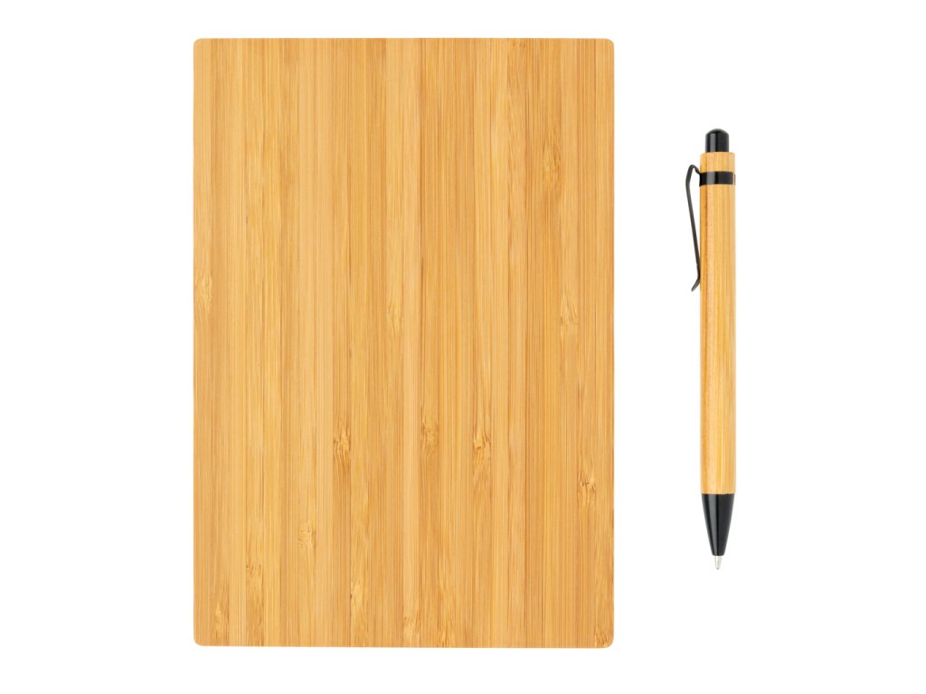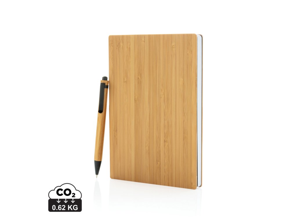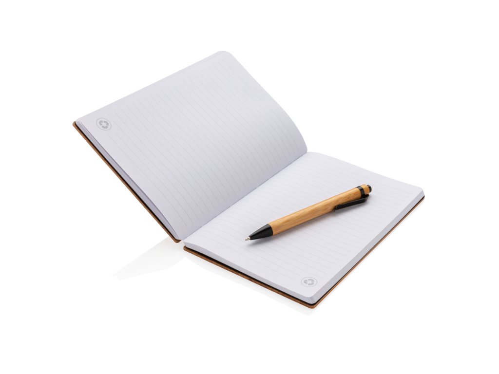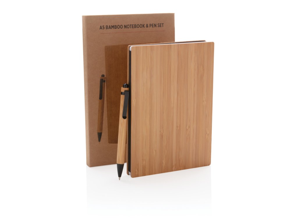 Ekologický set zápisníka a perá. Zápisník s bambusovým obalom, 90 listy/180 stranami recyklovaného papiera s gramážou 70g/m2. Bambusové guličkové pero s čiernym atramentom. Balené v kraftovej darčekovej krabičke.Dodatočné parametre