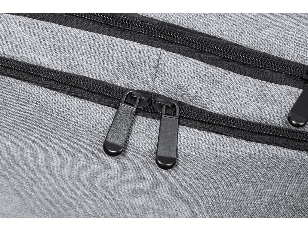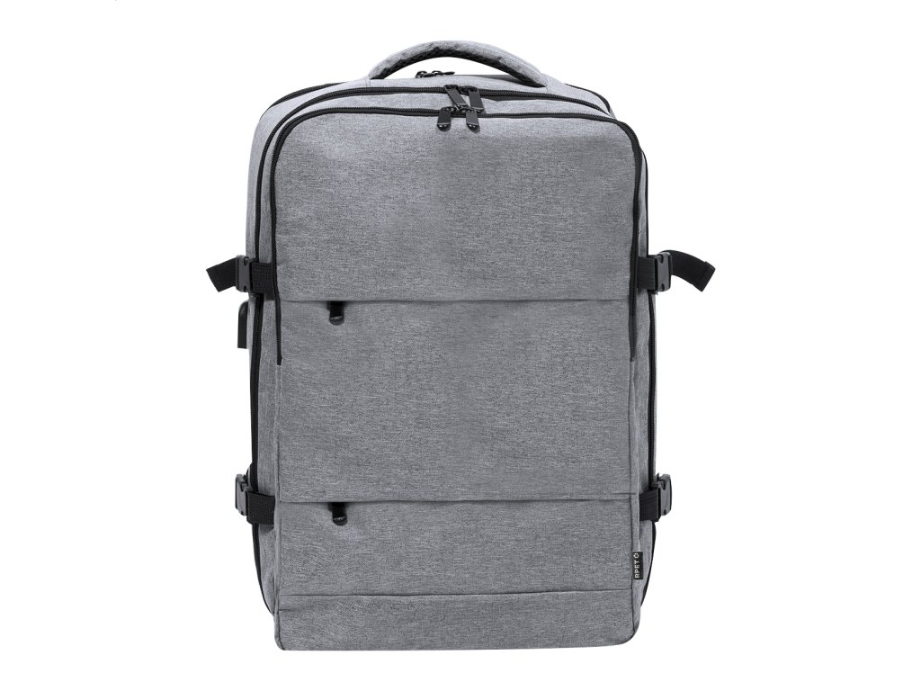 Vodeodolný RPET batoh s 3 hlavnými priehradkami na zips, 2 prednými vreckami na zips, bočným vreckom na zips a skrytým vreckom proti krádeži. S polstrovanou priehradkou na notebook (17") a priehradkami na topánky, vystuženým chrbtom a ramennými popruhmi. S popruhom na vozík a vstavaným USB pripojením pre power banky. Polyester 300D RPET s výrazným štítkom RPET.Dodatočné parametre