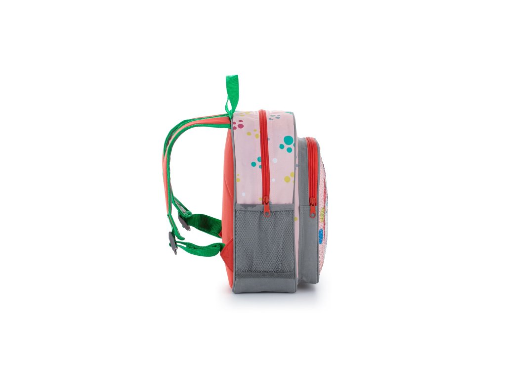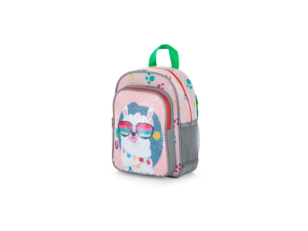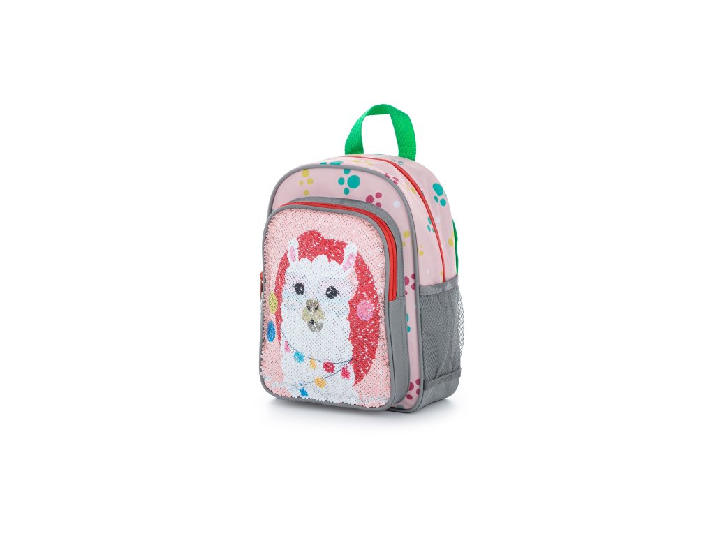 Menší batôžtek vhodný pre deti predškolského veku na voľnočasové aktivity.Má jedno veľké vrecko s flitrovým efektom, menšie vrecko na desiatu a postranné vrecká na fľašu na pitie.