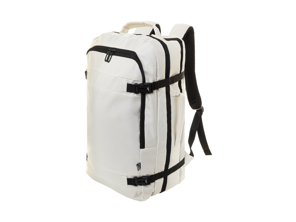 Dvojfunkčný RPET batoh a taška na dokumenty s 2 priehradkami na zips, predným vreckom na zips a polstrovanou priehradkou na notebook (15"). S vreckom proti krádeži, popruhom na vozík, polstrovaným chrbtom a ramennými popruhmi. Polyester 600D RPET, s výrazným.Dodatočné parametre