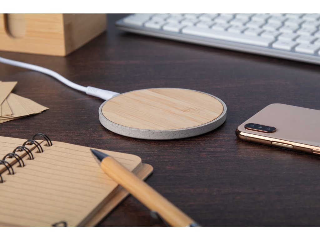 Bezdrôtová rýchlonabíjačka (15W) v ekologickom plastovom kryte z pšeničnej slamy a bambusu. Vrátane USB nabíjacieho kábla.Dodatočné parametre
