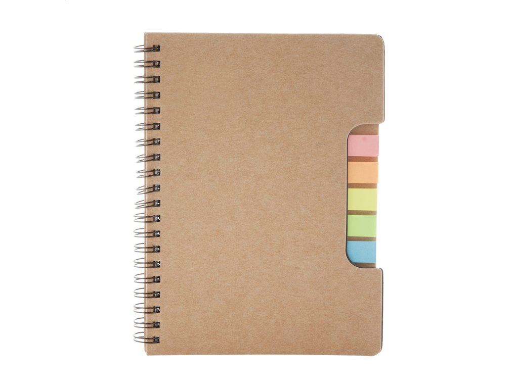 Blok z recyklovaného papiera, hrebeňová väzba, 60 linajkovaných listov, so samolepiacimi lístkami (5 x 25 ks).
