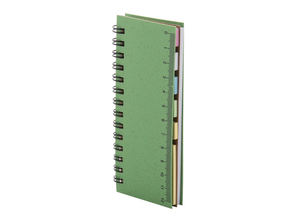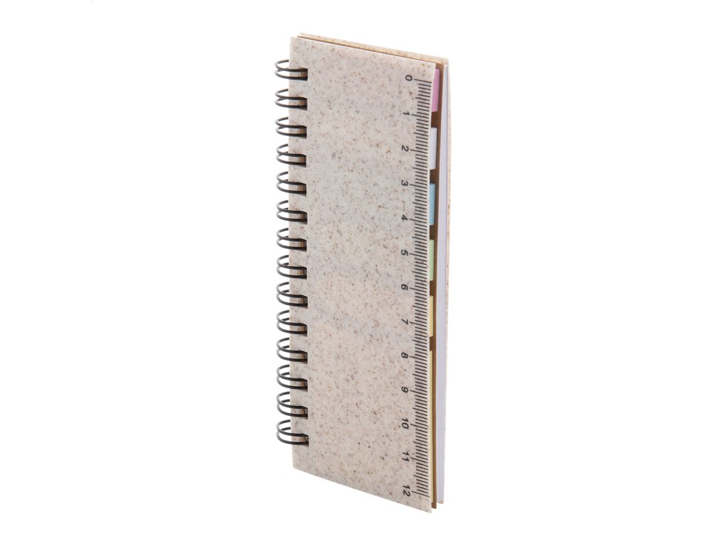 Ekologický špirálový blok potiahnutý plastom z pšeničnej slamy so 40 linajkovými listami z recyklovaného papiera, 25 lepiacimi papierikmi a 125 popisovačmi stránok (v 5 rôznych farbách). S pravítkom 12 cm na doskách.Dodatočné parametre