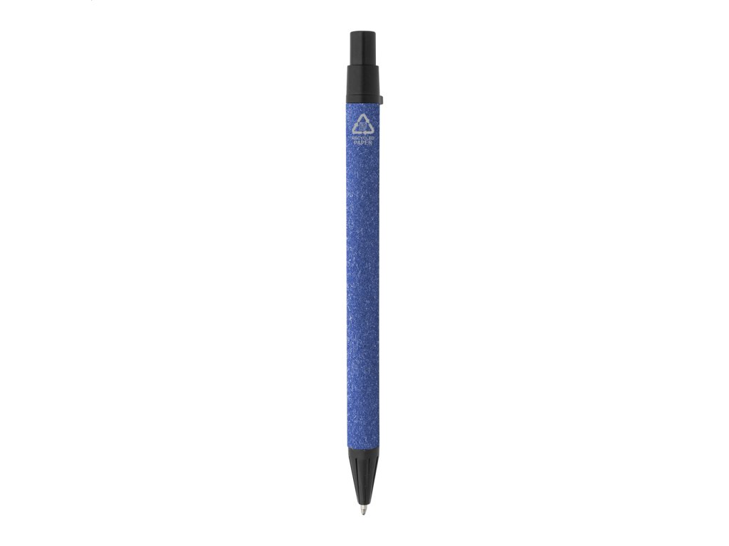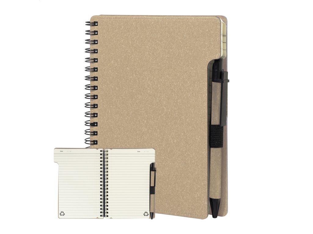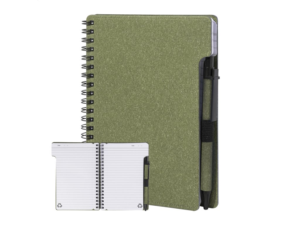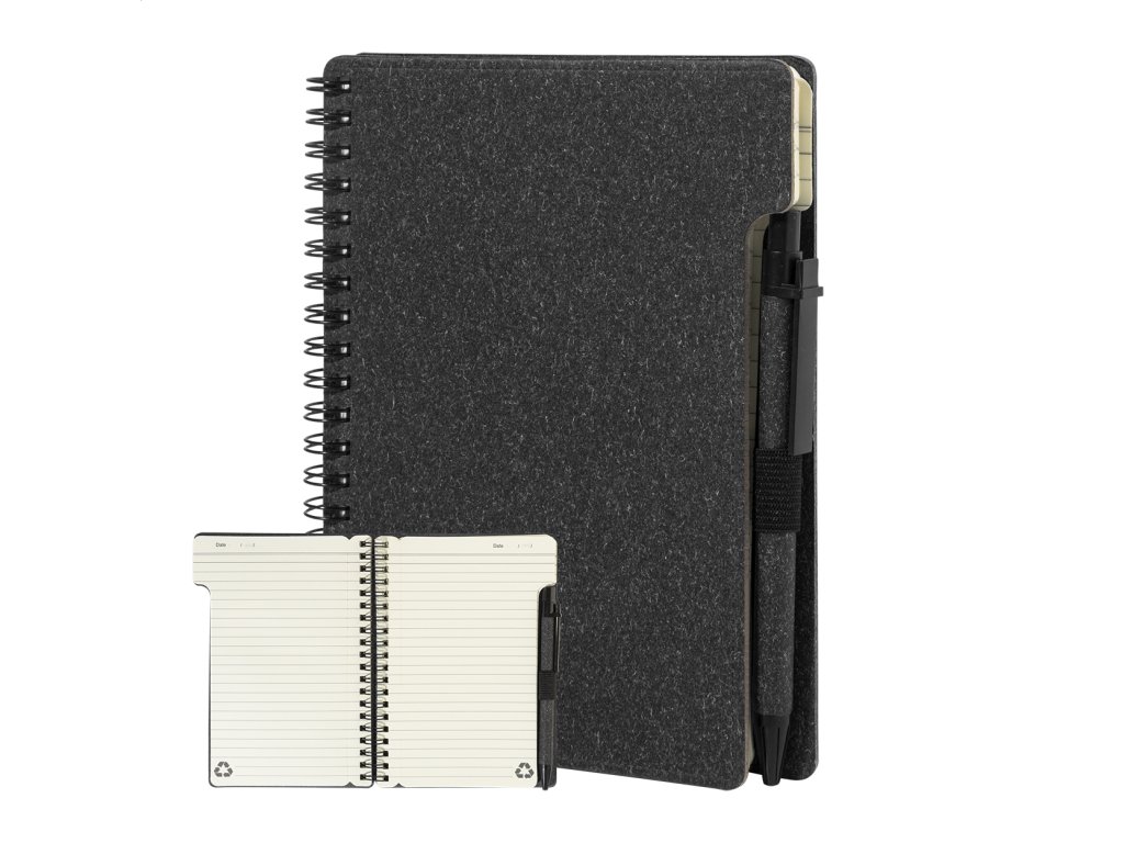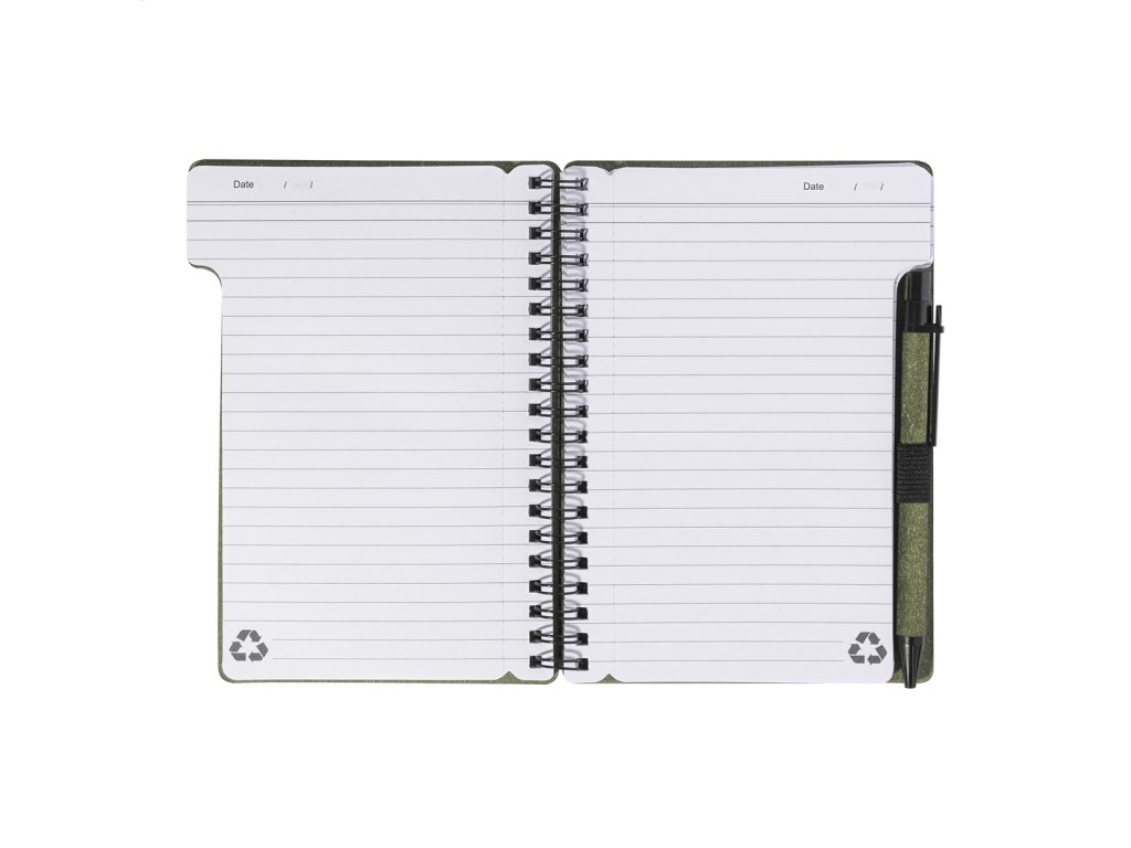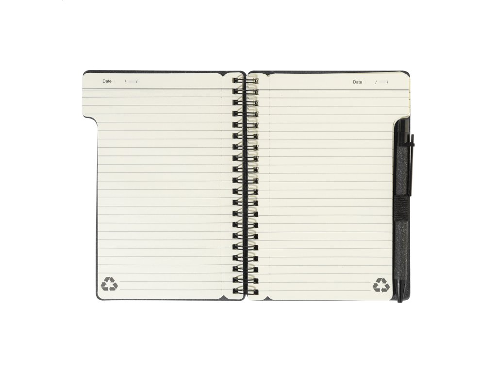 Špirálový blok A6 z recyklovaného papiera s 80 linajkovými listami. Vrátane recyklovaného papiera a guľôčkového pera z recyklovaného PP s modrou náplňou.Dodatočné parametre