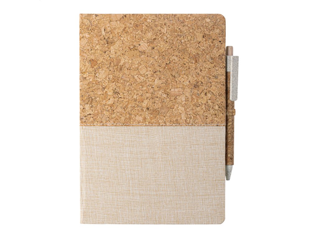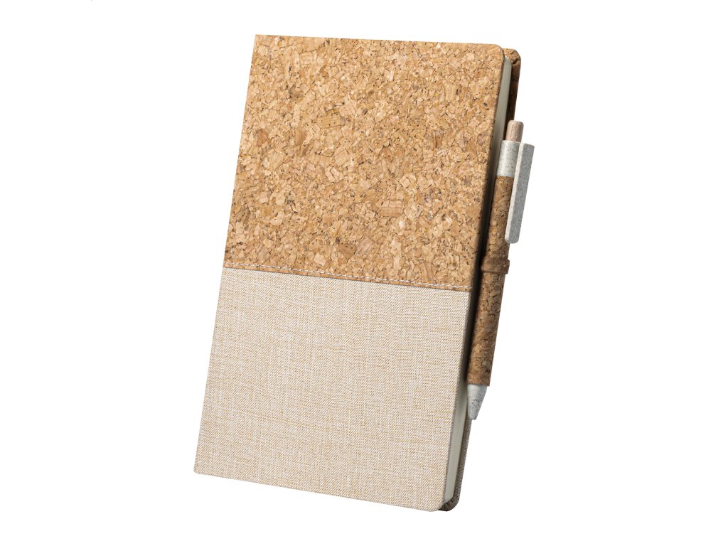 Blok A5 s doskami z prírodného korku a bavlny a 80 čistými listami. Vrátane guľôčkového pera z korku a pšeničnej slamy, s čiernou náplňou.