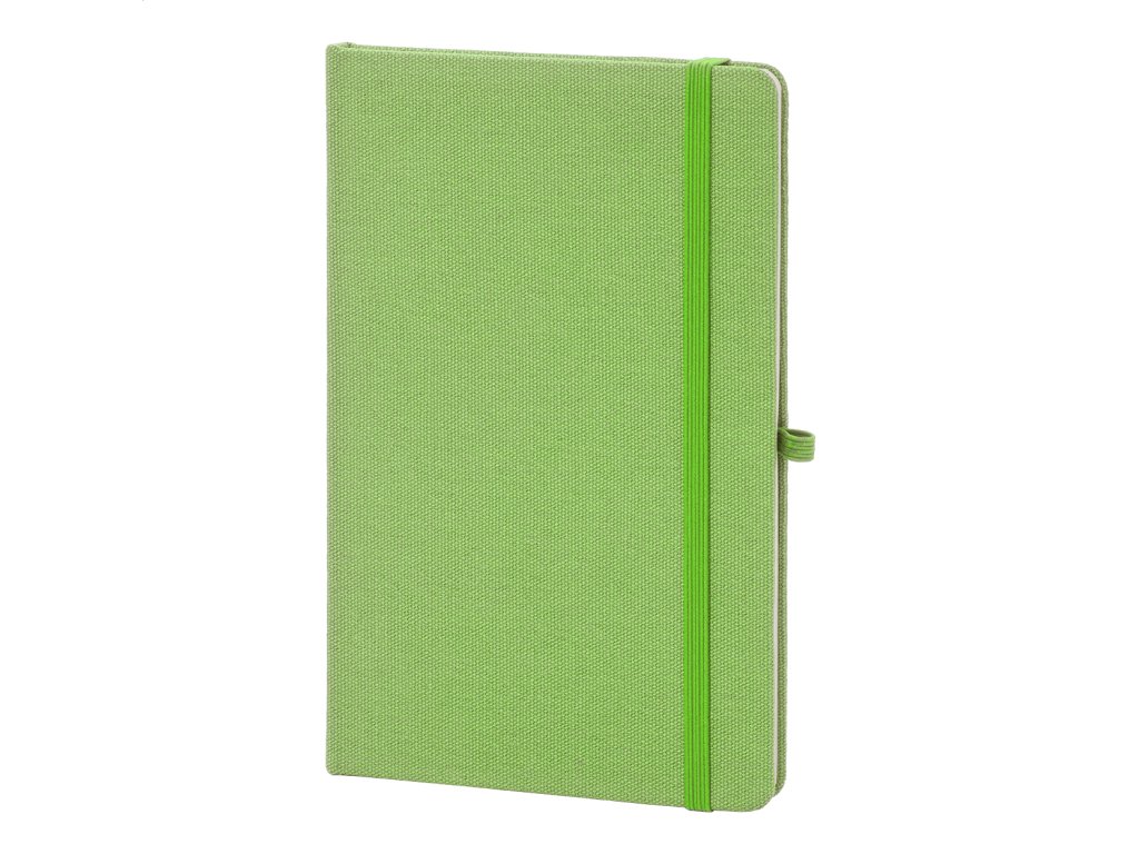 Blok potiahnutý recyklovanou bavlnou s 80 linajkovými listami z recyklovaného papiera. So záložkou v zodpovedajúcej farbe, gumičkou a držiakom na pero. Veľkosť A5.Dodatočné parametre