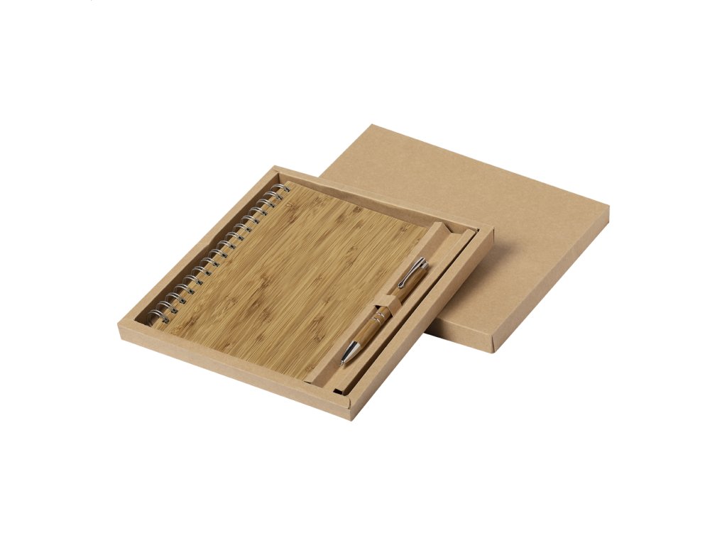 Blok A5 s hrebeňovou väzbou v bambusových doskách s 80 linajkovými listami. Vrátane guľôčkového pera z bambusu s čiernou náplňou. V kraftovej papierovej krabičke.Dodatočné parametre