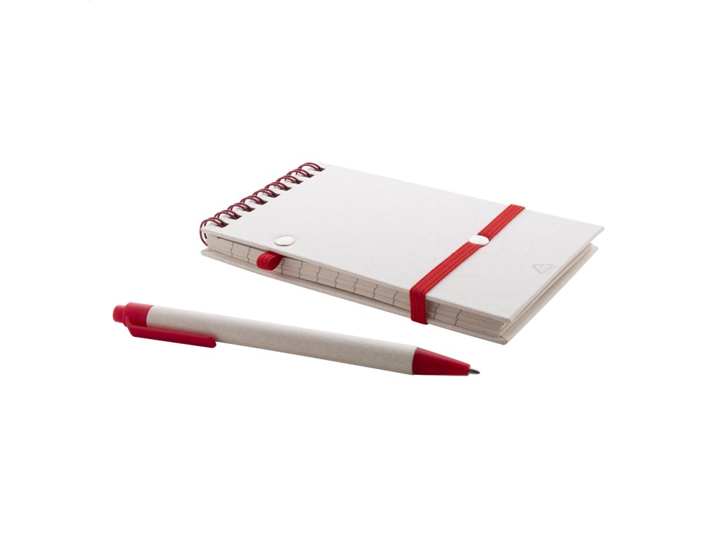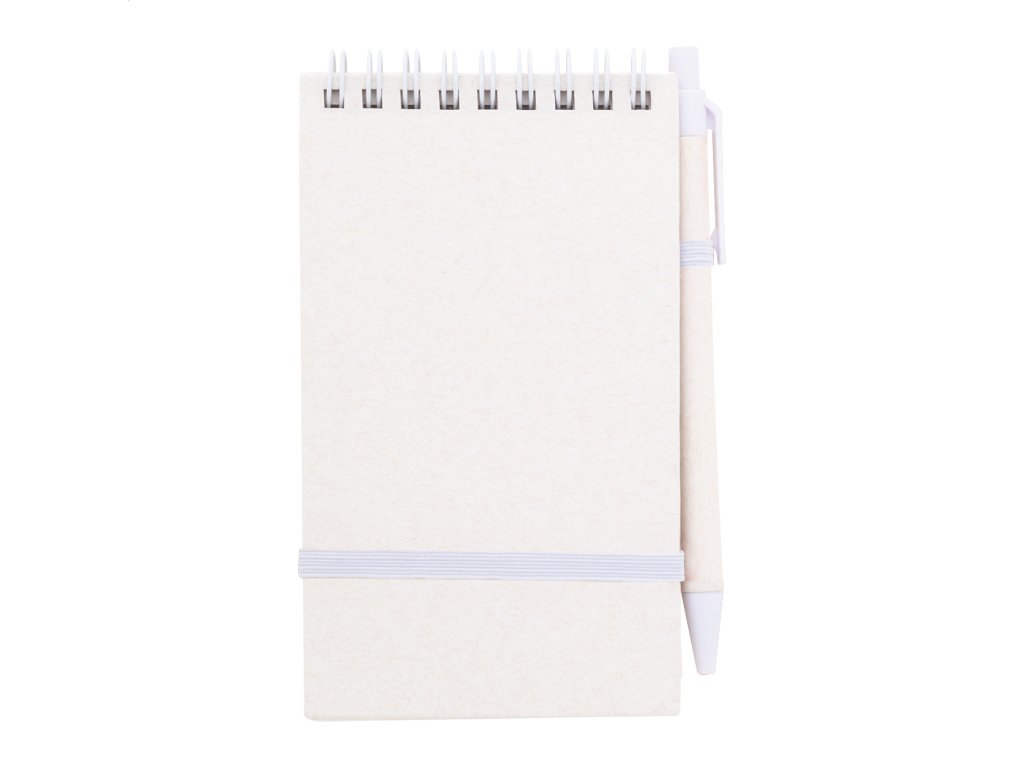 Špirálový blok A6 s doskami z recyklovaného z kartónu na mlieko s pevnou väzbou a 70 linajkovými listami. So špirálovými krúžkami v rovnakej farbe, gumičkou a pútkom na pero. Vrátane recyklovaného kartónového papiera na mlieko a recyklovaného ABS plastového guľôčkového pera s modrou náplňou.Dodatočné parametre