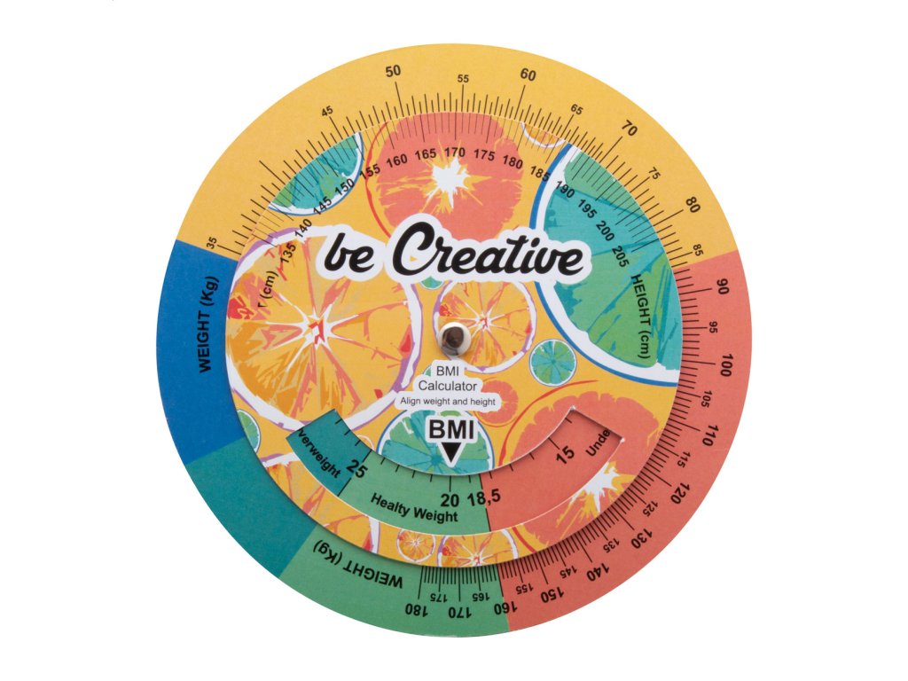 Papierový kotúč s BMI (Body Mass Index), vyrábaný na zákazku. Cena zahŕňa plnofarebnú potlač, nezahŕňa tlačovú prípravu. Min. mn.: 100 ks.Dodatočné parametre