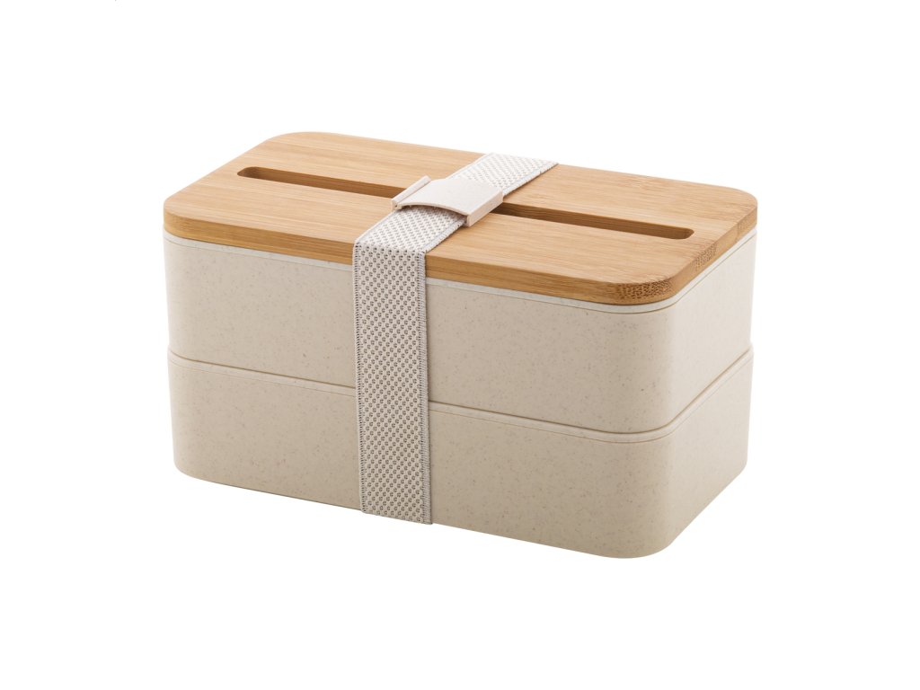 Box na jedlo z PP plastu so sadou príborov (vidlička, lyžica a nôž), bambusovým vekom s držiakom na mobilný telefón a elastickým popruhom. S 2 priehradkami s objemom 700 ml.Dodatočné parametre