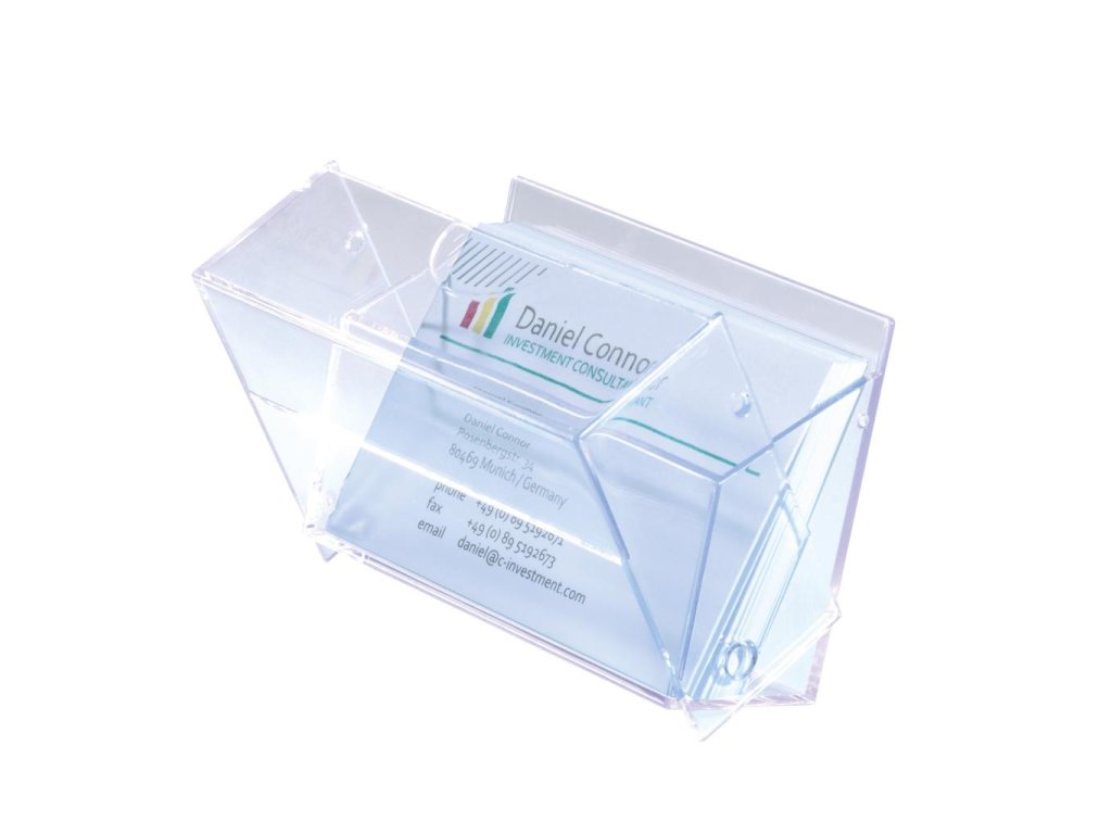 Priehľadný box na vizitky vyrobený z tvrdého plastu s praktickou doplnkovou funkciou: pri zatvorení bezpečne uchováva vložené vizitky a pri otvorení sa zmení na displej s vizitkami. Kapacita až 100 vizitiek (max. 86 × 56 mm). Vonkajšie rozmery (š × h × d) 95 × 60 × 30 mm.Dodatočné parametre