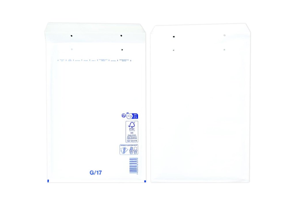 Extrémne ľahké, bezpečné a hospodárne obálky. Jednoduchý spôsob balenia samolepiacim uzáverom. Vďaka špeciálnej fólii s vankúšikmi, plnenými vzduchom a papieru Kraft, potiahnutému polyetylénom, sú obálky elastické a odolné voči roztrhnutiu a vode. Farba biela. Vnútorný rozmer 24 x 34 cm.Kód : G17