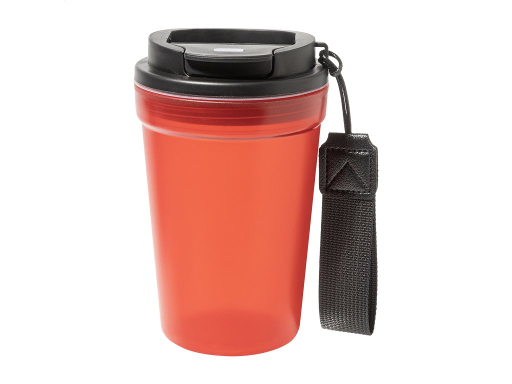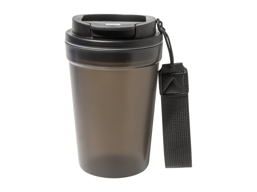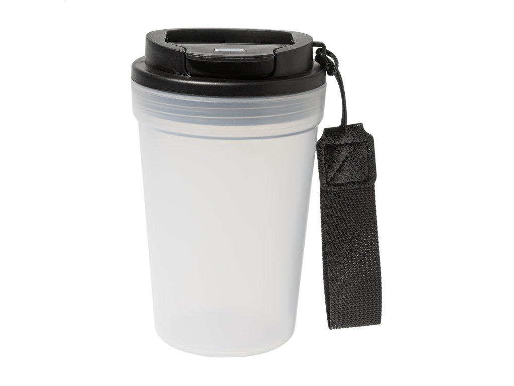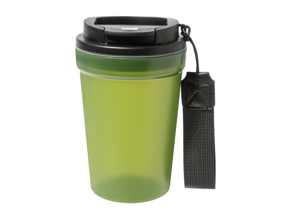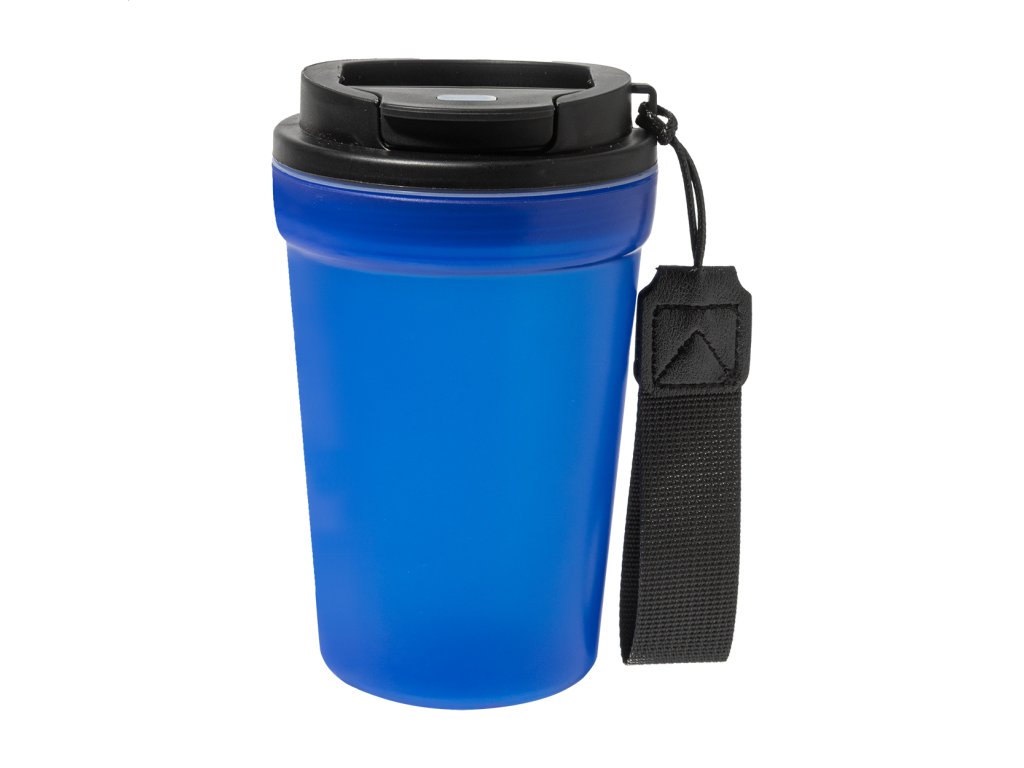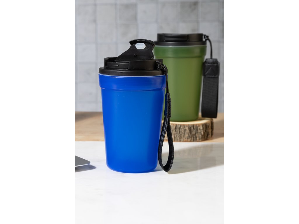 Jednostenný cestovný kelímok z PP plastu s matnou povrchovou úpravou, viečkom na pitie a popruhom z RPET polyesteru. 400 ml.Dodatočné parametre