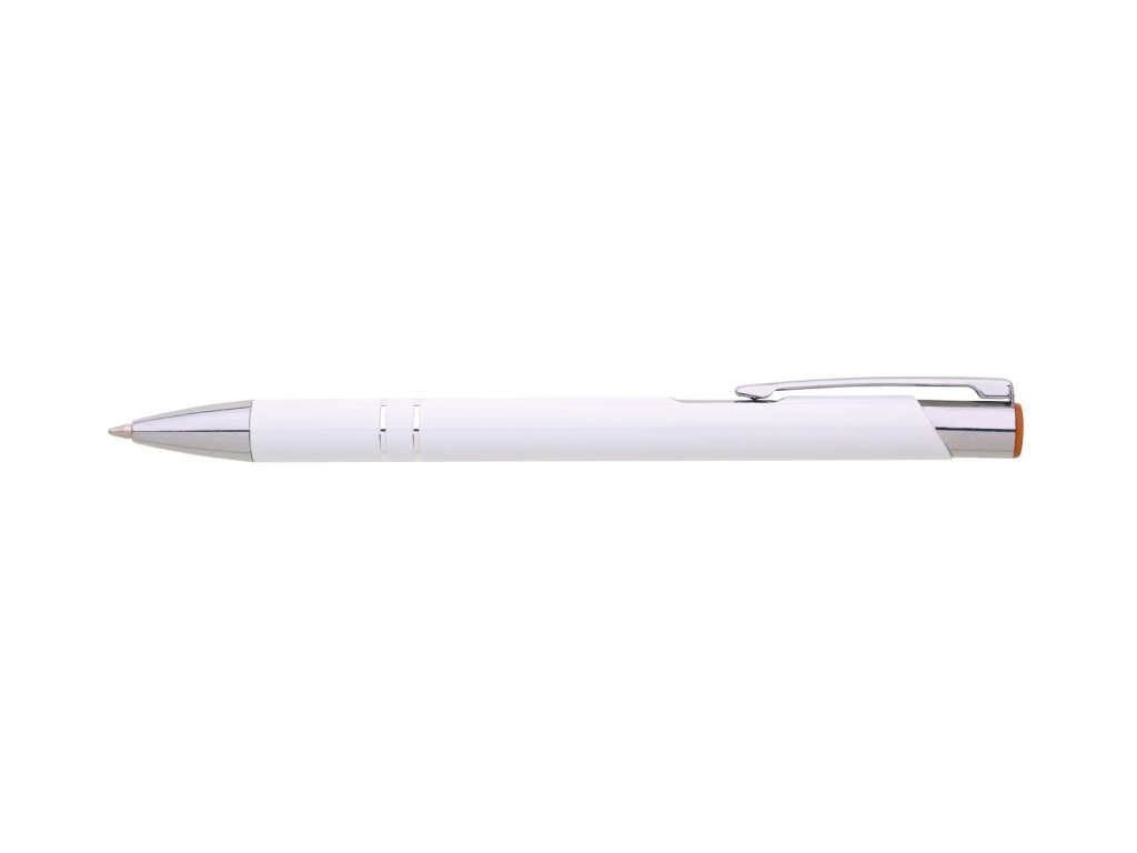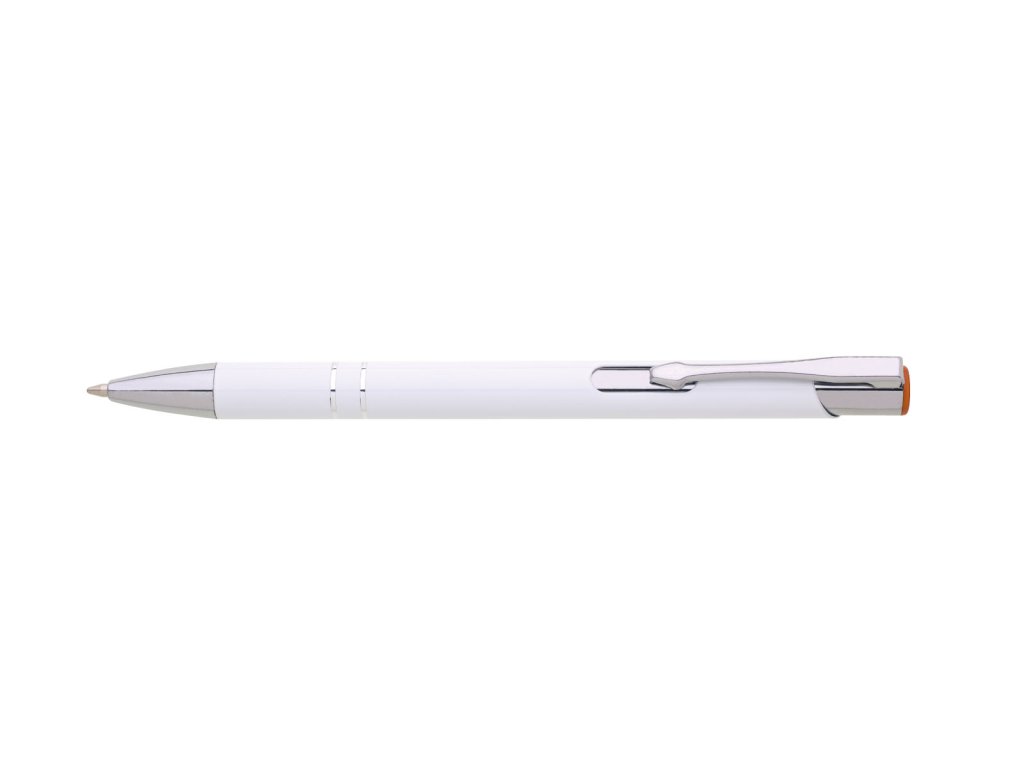 Kovové hliníkové pero s bielym povrchom a farebným lesklým laserom vo farbe horného ukončenia pera. Telo zdobené dvoma striebornými prúžkami. Náplň veľkoobsahová, modro píšuca.Dodatočné parametre
