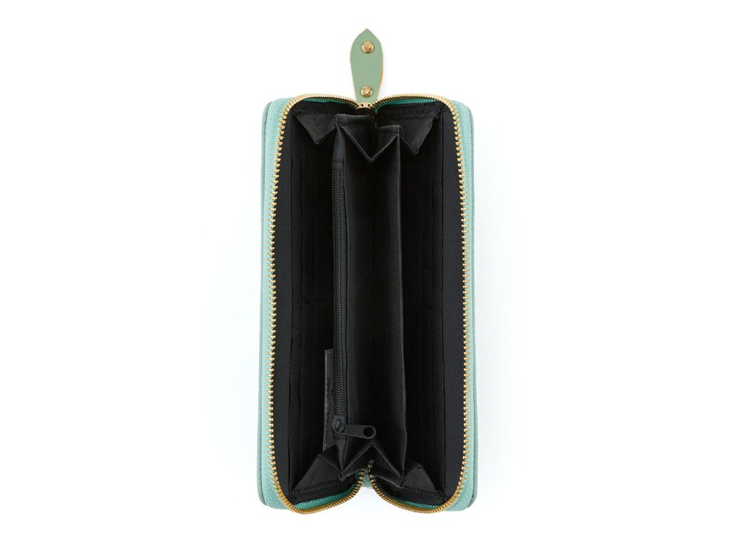Vo vnútri je 8 menších vreciek na vernostné karty, 2 väčšie vrecká, 3 oddelené priehradky na hotovosť a 1 uzatvárateľné vrecko na zips na drobné mince.
