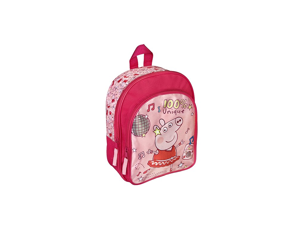 Detský predškolský batoh s motívom Peppa Pig. Detský batoh sa skladá z jednej hlavnej priehradky a predného menšieho vrecka. Materiál 100% polyester.Dodatočné parametre