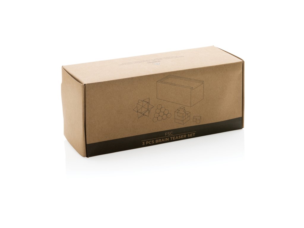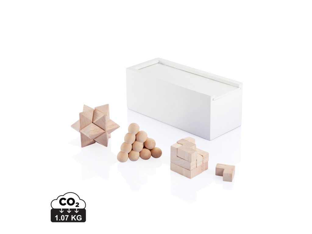 Zábavná sada 3ks hlavolamov na precvičenie vášho myslenia. Biela borovicová krabička na jednoduché uloženie. Vyrobené z FSC® certifikovaného dreva. Balené v FSC® kraftovej darčekovej krabičke.Dodatočné parametre