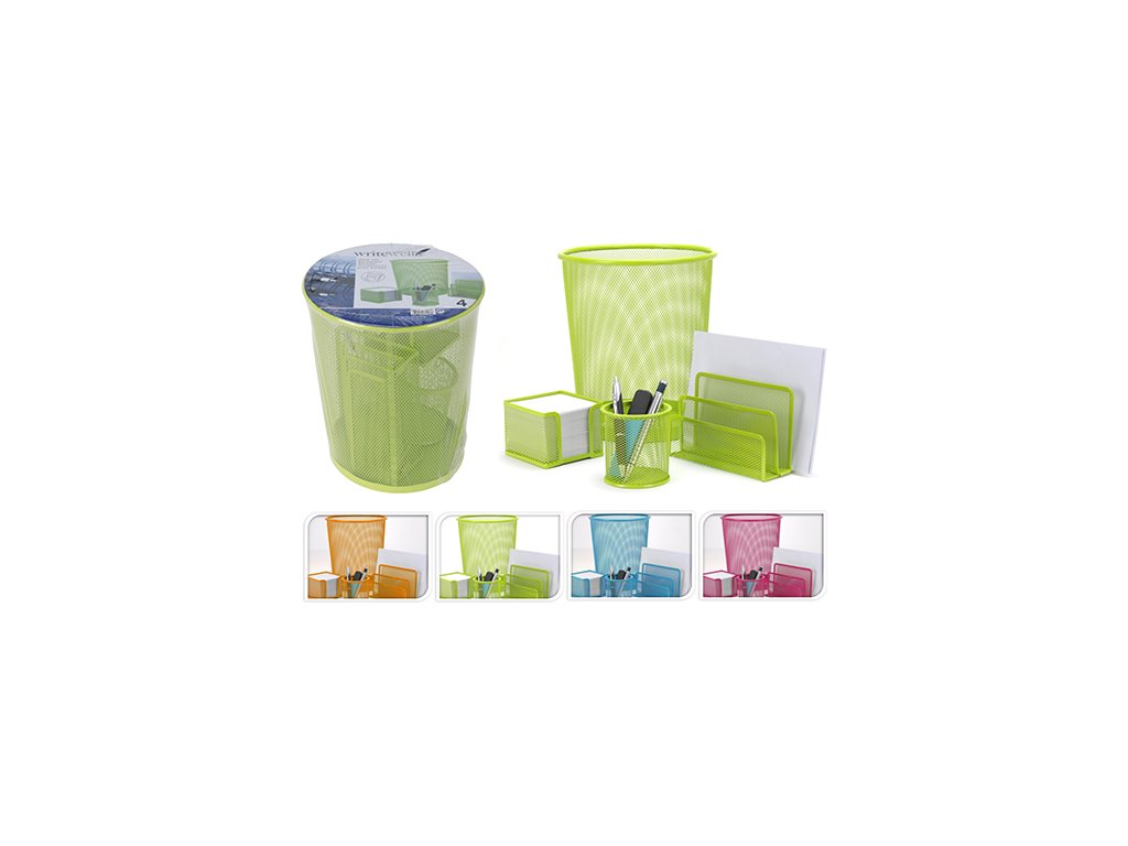 Drôtená sada kancelárskych doplnkov - obsahuje kôš - 235x270 mm, stojan na listy - 175x82x135 mm, stojan na perá - 90x100 mm a stojan na špalík - 100x100x76 mm. K dispozícii v 4 farebných prevedeniach.variantu vyberte v poli nad cenovkou