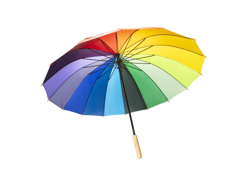 Veľký automatický vetruodolný dáždnik so 16 dúhovými panelmi. S drevenou rukoväťou, kovovým rámom a rebrami zo sklených vlákien. 190T pongee.Dodatočné parametre