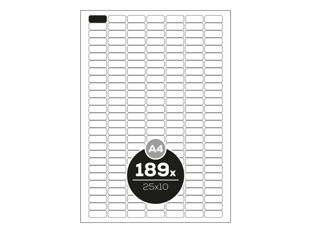 Etikety PRINT A4/100 ks, 25x10 - 189 etikiet, biele. Biele etikety vhodné pre laserové a atramentové tlačiarne, ako aj pre kopírovacie stroje.Dodatočné parametre