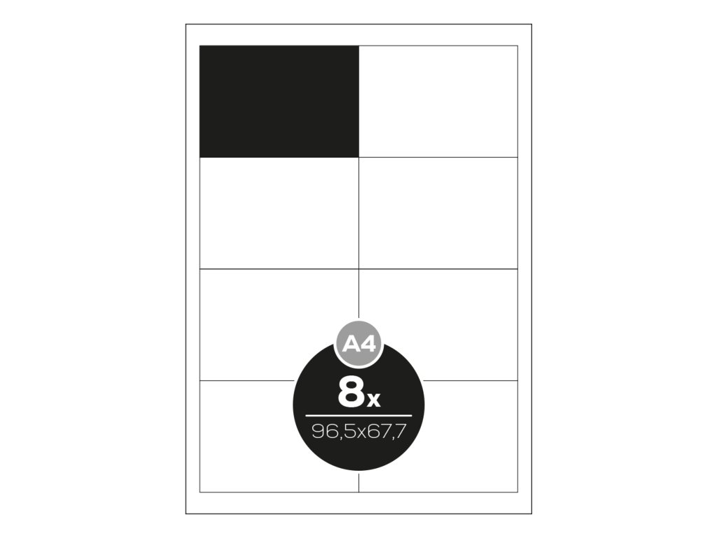 Etikety PRINT A4/100 ks, 96,5x67,7 - 8 etikiet, biele. Print etikety s bezpečnostným okrajom, ktorý zabraňuje vytečeniu lepidla.Dodatočné parametre