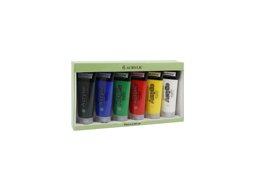 Akrylové farby 6x 75ml možno aplikovať na všetky bežné podklady ako je papier, lepenka/doska alebo plátno. Farby sú rýchloschnúce a vláčne. Môžu byť použité priamym vytlačením z tuby alebo riedené vodou. Balenie obsahuje 6 farieb o objeme 75 ml. Sada obsahuje farby: čierna, modrá, zelená, červená, žltá a biela.Dodatočné parametre