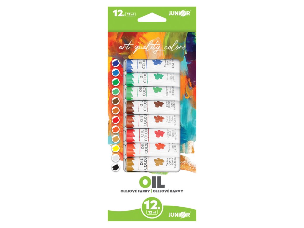 Olejové farby v jasných odtieňoch, s hustou konzistenciou a veľmi dobrou krycou schopnosťou. Farby sa dajú použiť priamým vytlačením z tuby a možno ich aplikovať na všetky bežné olejové podklady. Sada obsahuje 12 farebných odtieňov v tubách o objeme 12ml, uložených v papierovej krabičke. Kvalitné, cenovo dostupné farby, ktoré firma JUNIOR ponúka pod vlastnou značkou. Rozmer balenia: 10,5x25 cm.Dodatočné parametre