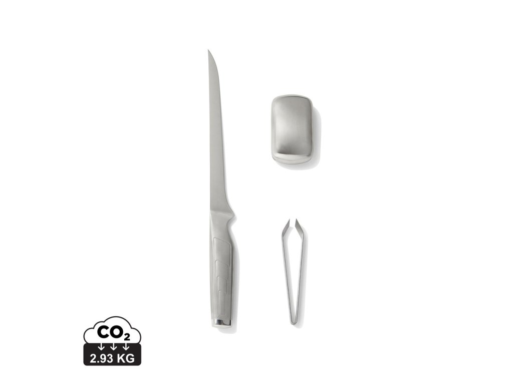 Filetovací nôž vyrobený z kvalitnej japonskej ocele 420J. Filetovací nôž má dlhú, tenkú a pružnú čepeľ – ideálnu na presné rezanie. Používa sa napríklad na filetovanie rýb alebo krájanie šunky. Sada obsahuje kovové mydlo, ktoré odstraňuje pachy, napríklad od rýb a cesnaku. Balenie obsahuje aj pinzetu na odstraňovanie malých kostí z rýb. Ideálny darček pre milovníkov varenia.Dodatočné parametre