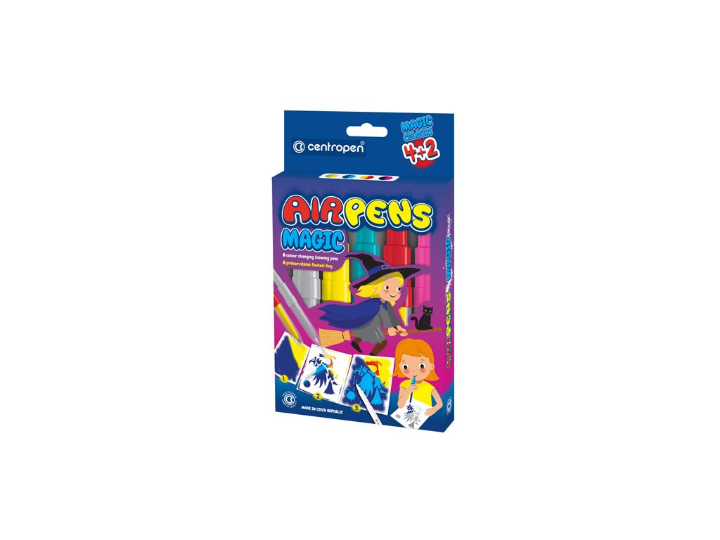 Magické fúkacie fixy na papier. Sada obsahuje 5 farebných fixiek a 1 klasický zmizík. Atramenty sú prefarbiteľné zmizíkom. Súčasťou balenia je 8 šablón.