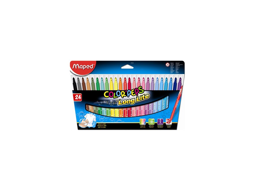 Farebné fixy , ľahko vyprateľný a zmývateľný atrament. Hrot odolný proti zatlačeniu či poškodeniu, žiarivé farby. Trojhranný tvar pre lepšie a pohodlnejšie uchopenie. Dlhá životnosť. Šírka stopy 3,6 mm. Stredne hrubý hrot vhodný na kreslenie a maľovanie. Balenie obsahuje 24 ks. Francúzka značka MAPED zaručuje vysokú kvalitu, funkčnosť a moderný dizajn.Dodatočné parametre