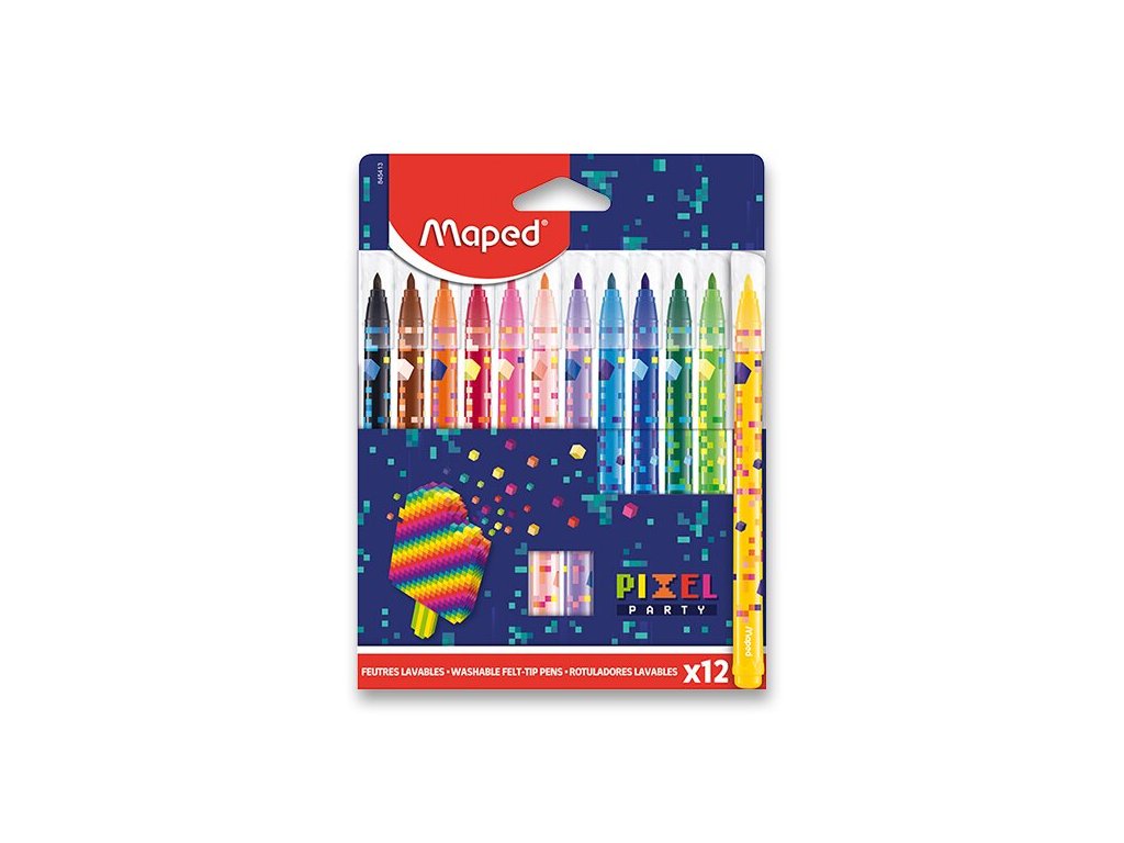 Súprava 12 farebných fixiek Maped Pixel Party vo veselých farebných kombináciách s atraktívnym dizajnom inšpirovaným hernými kódmi.