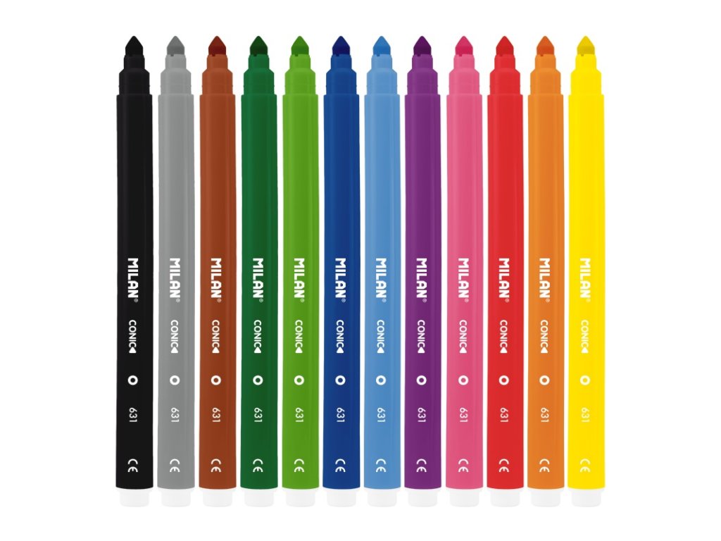 Fixy MILAN s kónickým hrotom (5mm) so silnou a odolnou špičkou. Špička môže byť použitá na jemné linky (0,75mm) alebo silnejšie linky až 3 mm. Hroty sú ideálne pre menšie kresby a väčšie diela, ako sú nástenné plagáty. Atrament na vodnej báze produkuje svetlé farby, ktoré sú ľahko použiteľné a sú miešateľné. balenie obsahuje 12 ks.Dodatočné parametre