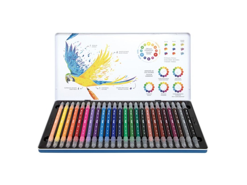 Plechová krabička obsahuje24 farebných fixiek s dvojitým hrotom.