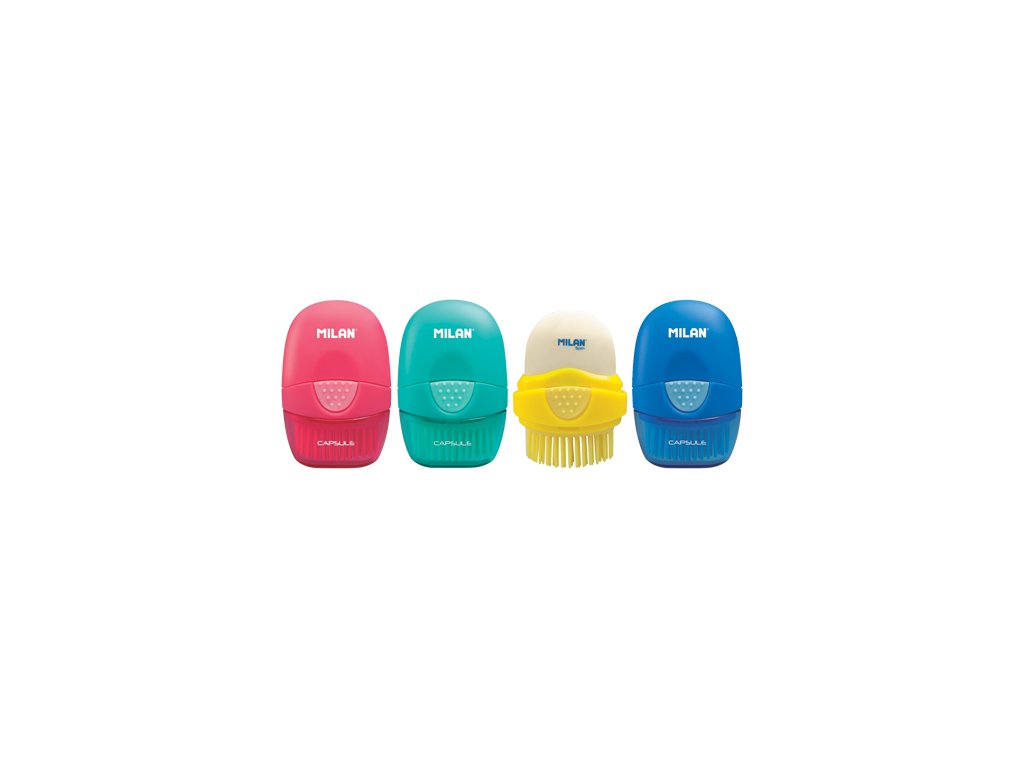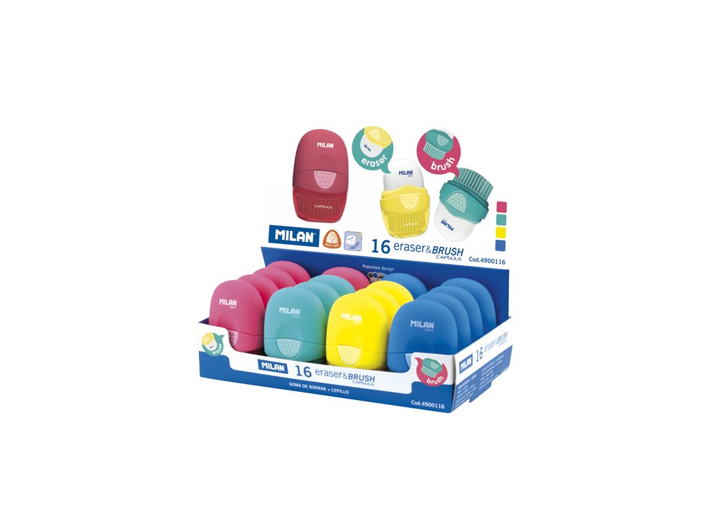 Guma MILAN s kefkou v obľúbenom dizajne Capsule. Z jednej strany sa nachádza guma na gumovanie, na druhej strane gumová kefka, ideálna na šetrné odtránenie zvyškou gumovania. Obidve časti sú chránené krytom proti prípadnému zašpineniu. V ponuke v štyroch farbách: červená, zelená, žltá, modrá.Dodatočné parametre