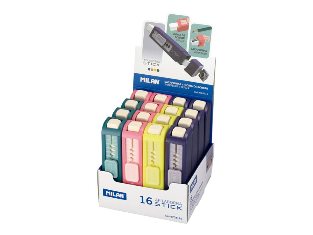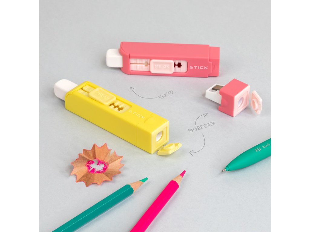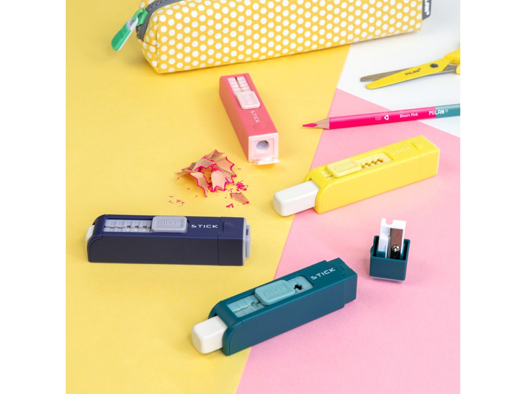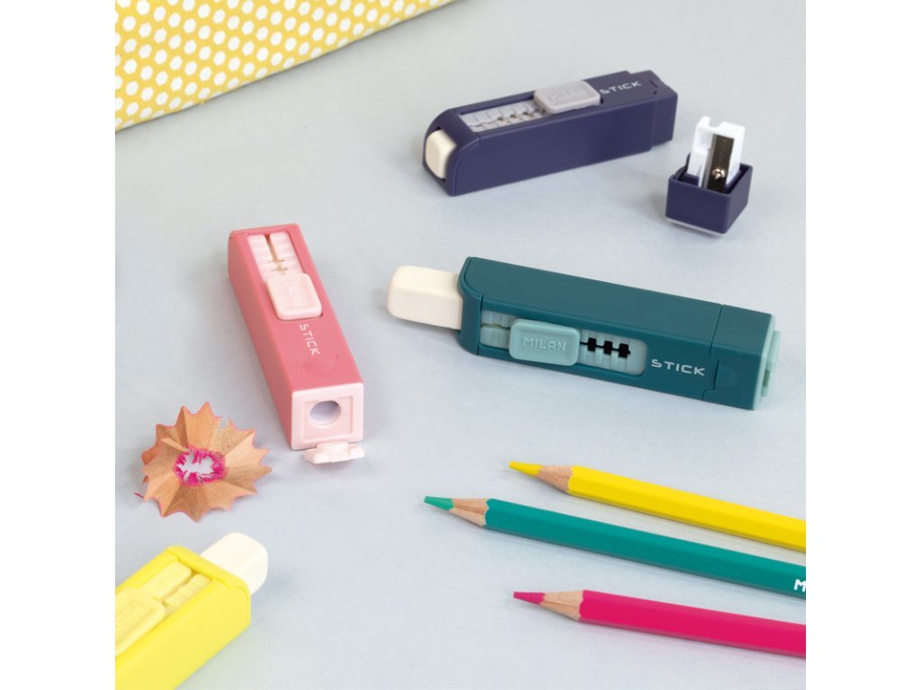 Guma so strúhadlom MILAN Stick. Výsuvná mäkká syntetická guma, ktorá je vhodná pre širokú škálu grafitových ceruziek. Ostrá, odolná uhlíková čepeľ strúhadla so systémom, ktorý zabraňuje oddeleniu ostria od strúhadla. Ideálne pre použitie v škole.Dodatočné parametre
