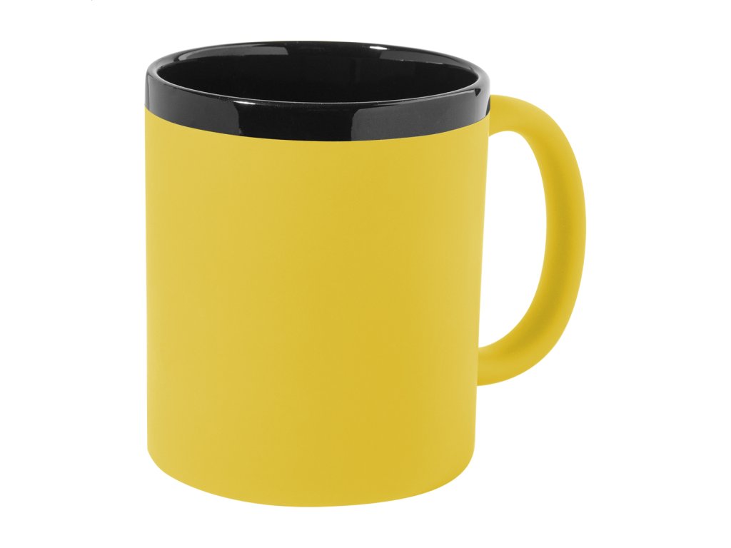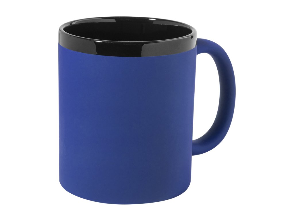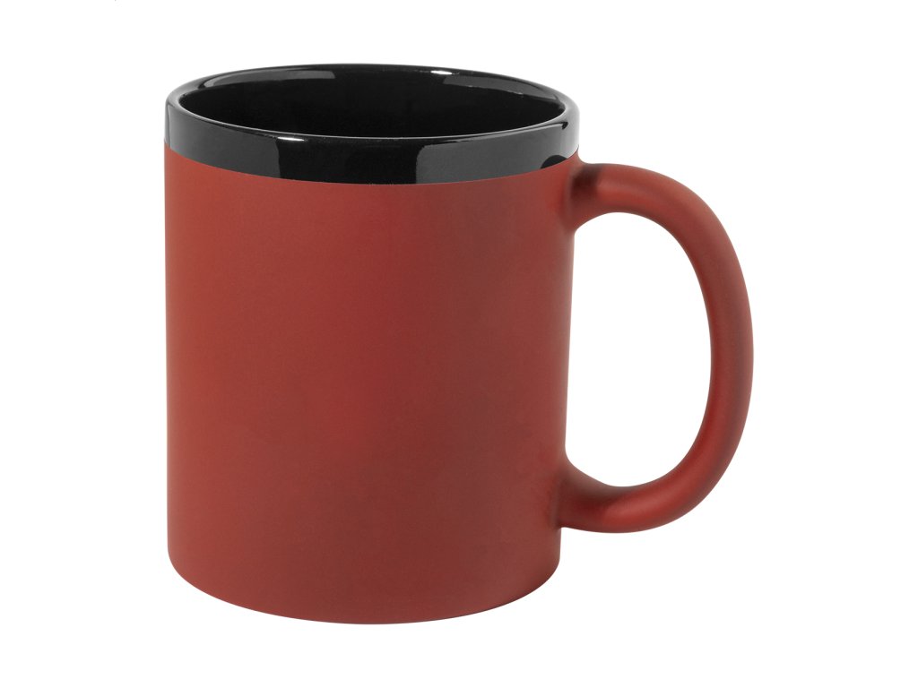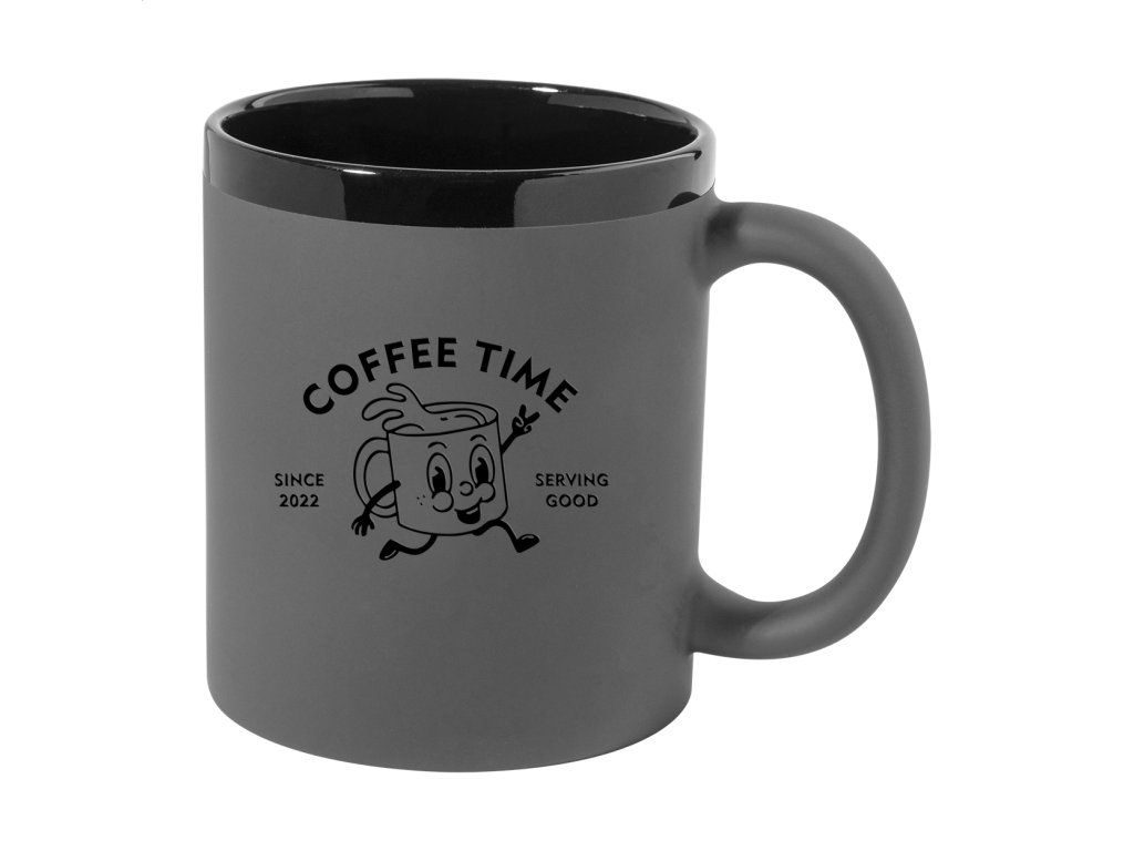 Keramický hrnček s mäkkým pogumovaným povrchom a čiernym vnútrom a okrajom, 300 ml. So špeciálnym povrchom na gravírovanie, gravírované logo ladí s farbou na vnútornej strane. V krabičke z kraftového papiera.Dodatočné parametre