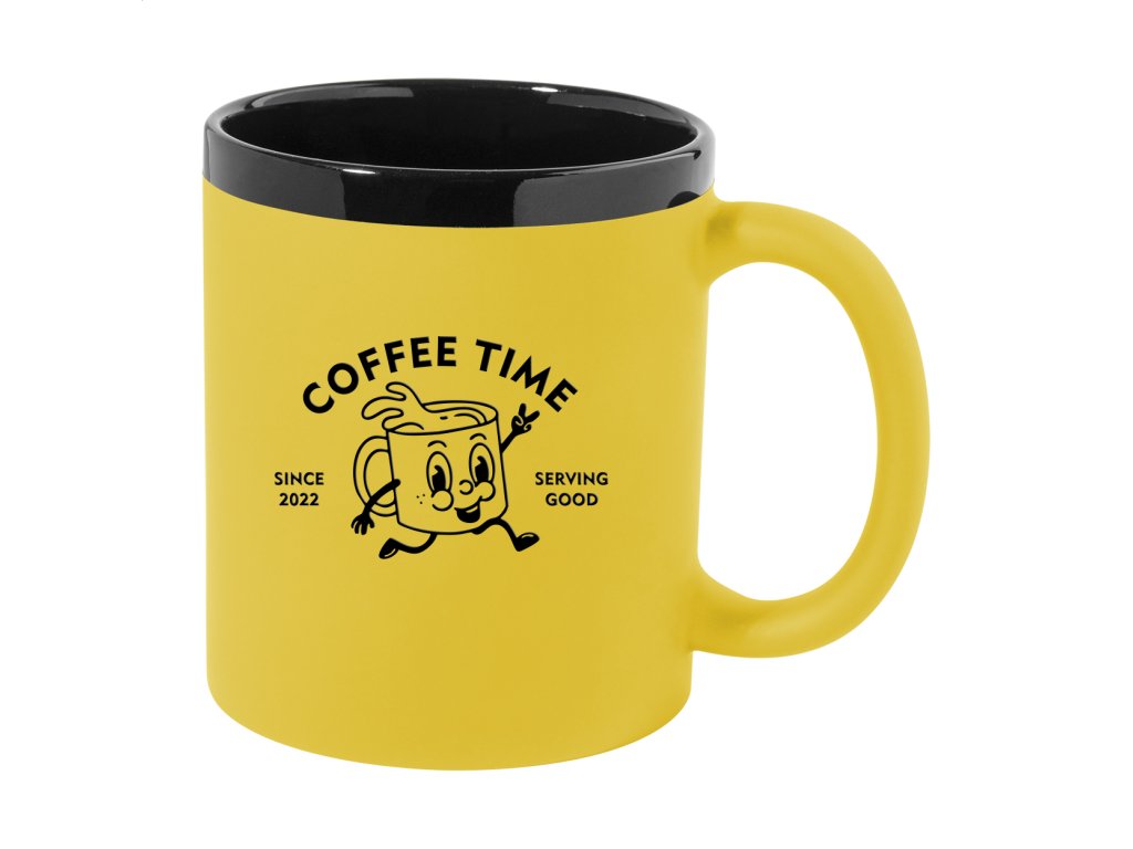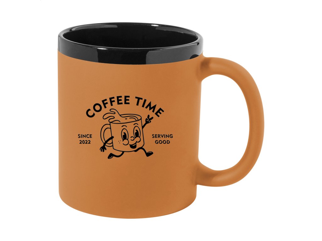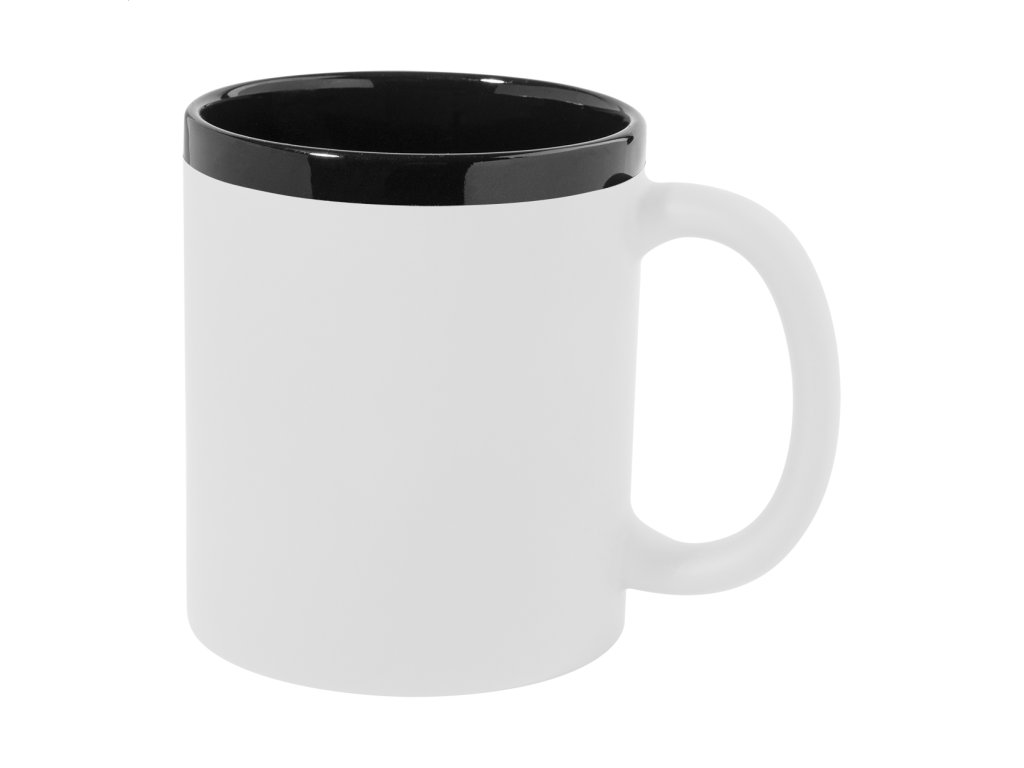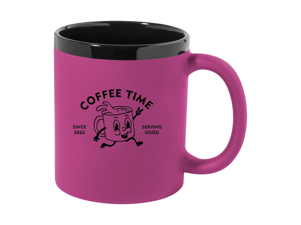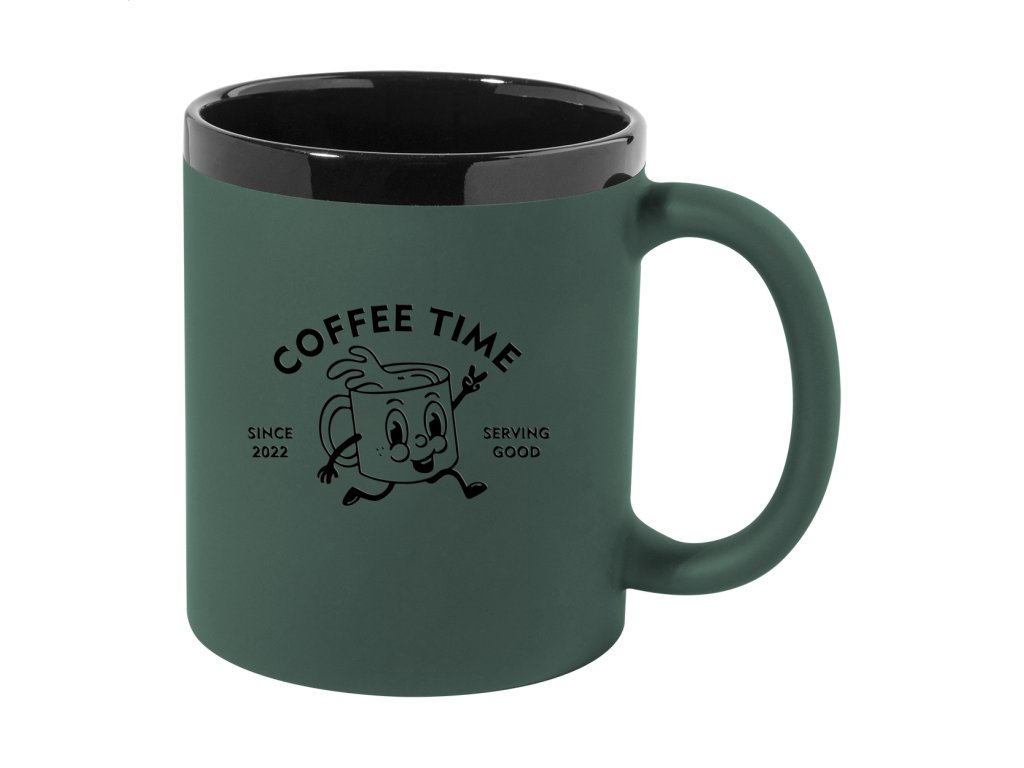Keramický hrnček s mäkkým pogumovaným povrchom a čiernym vnútrom a okrajom, 300 ml. So špeciálnym povrchom na gravírovanie, gravírované logo ladí s farbou na vnútornej strane. V krabičke z kraftového papiera.Dodatočné parametre
