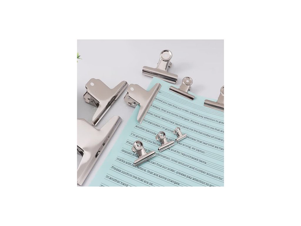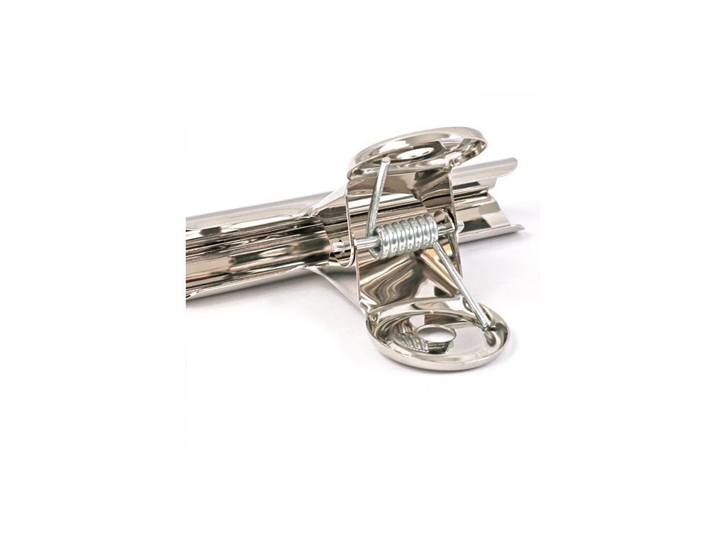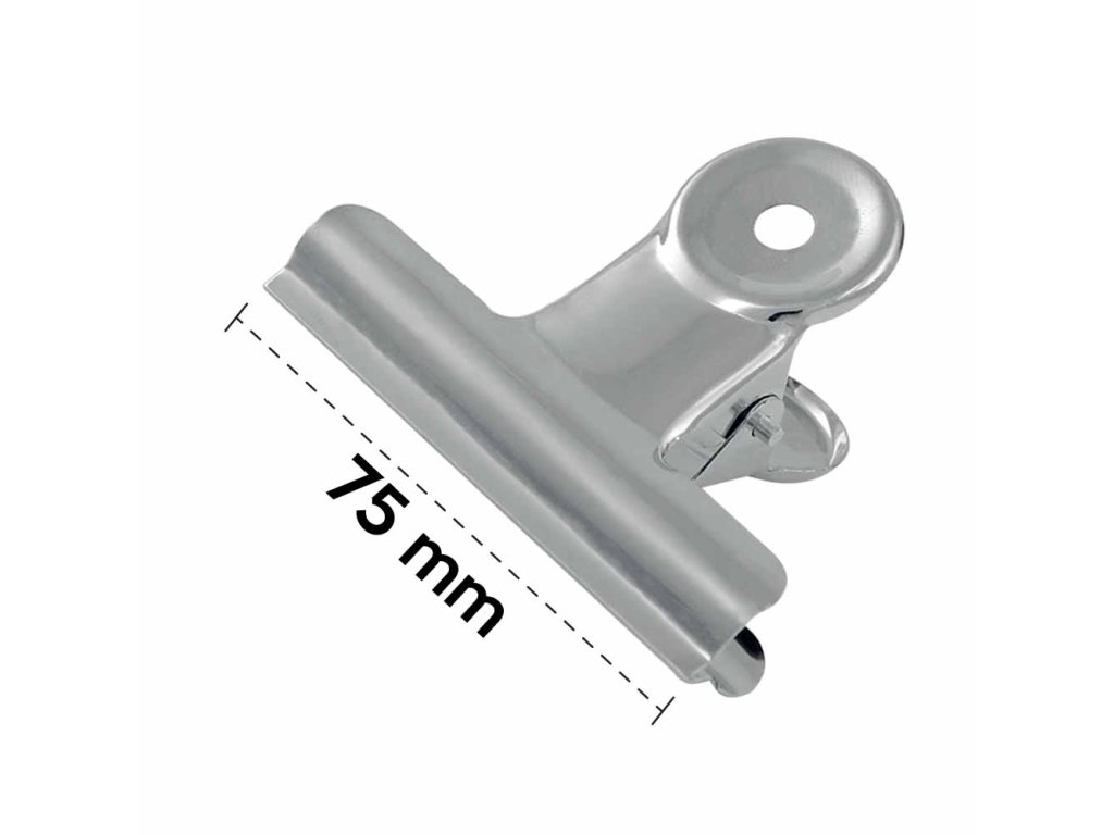 Pružinový klip kovový, 75 mm. Pochrómované klipy so silnou pružinou na zopnutie papierov, uzavretie obalov apod.