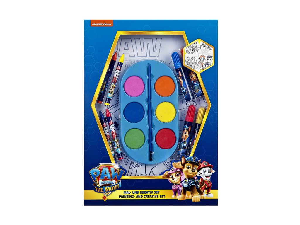 Menšia maliarska sada s motívom Labková Patrola obsahuje 6 farbiacich listov, 4 pastelky, 3 fixky, 6 akvarelov s paletou a 1 štetec.