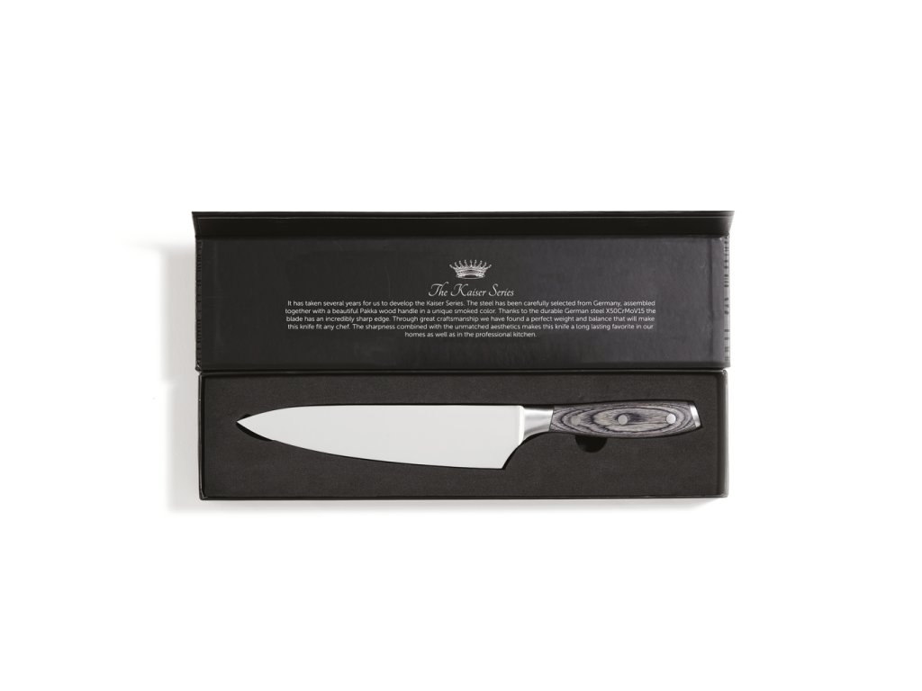 Kuchársky nôž z nemeckej ocele X50CrMoV15 s rukoväťou z dreva pakka. Vďaka ľahko uchopiteľnej rukoväti a vynikajúcemu vyváženiu čepele je práca s nožom pohodlná a jednoduchá. Veľkosť: 20 cm čepeľ.Dodatočné parametre