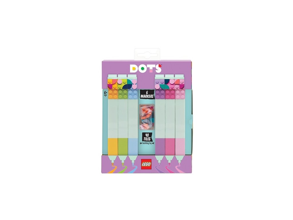 LEGO DOTS fixy různých barev (mix 6 barev). Součástí balení je 40 LEGO DOTS dílků pro individuální vyzdobení fixů. Součástí fixů jsou 2 LEGO destičky pro spojení např. s LEGO pouzdrem, minifigurkou, jiným perem nebo k nacvaknutí na LEGO pravítko.Dodatočné parametre