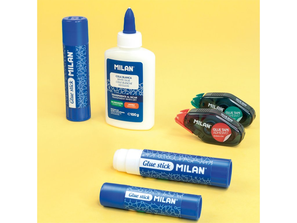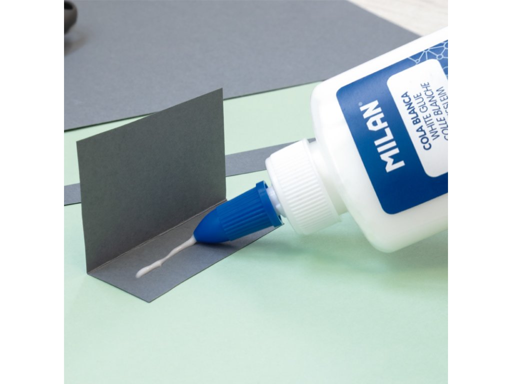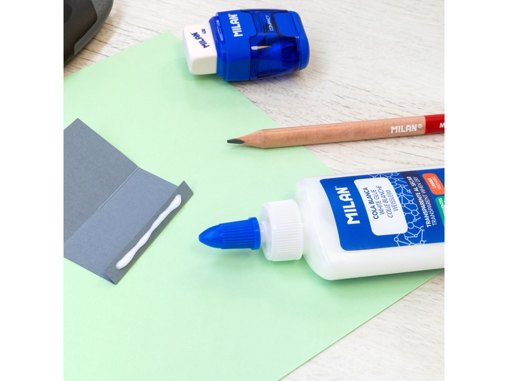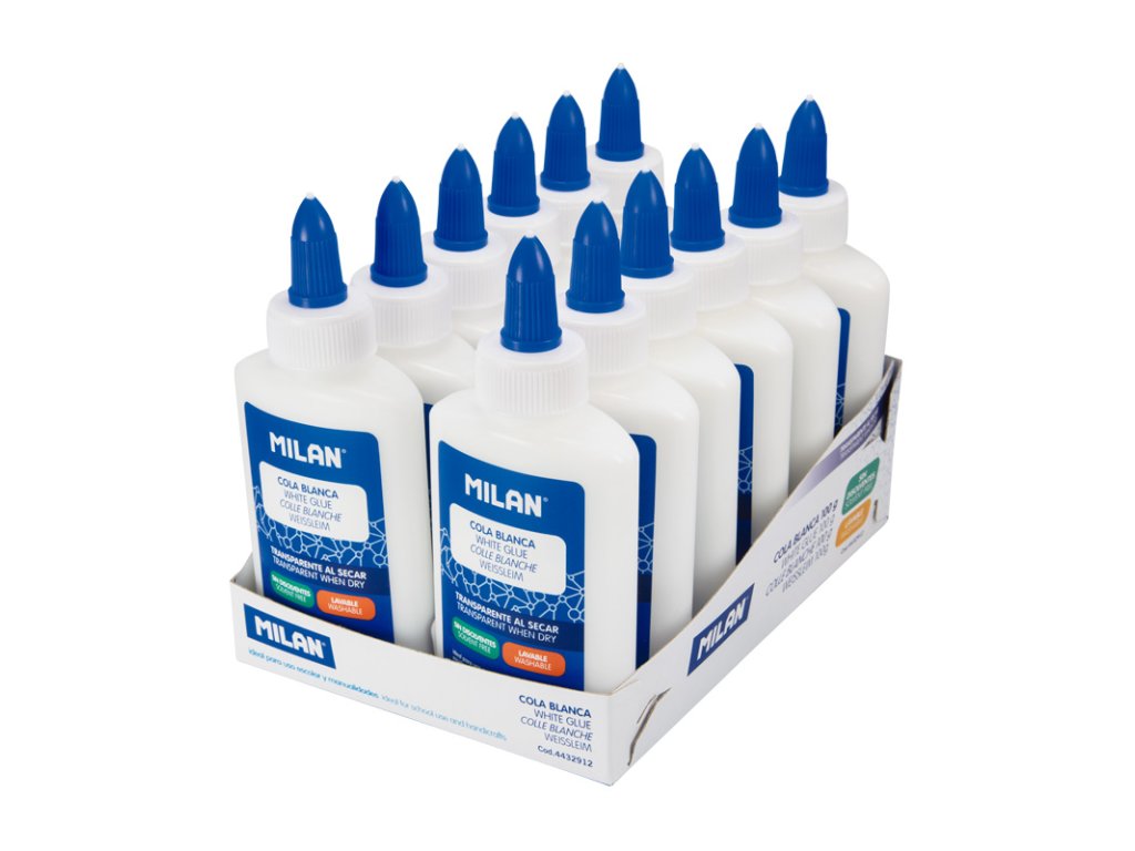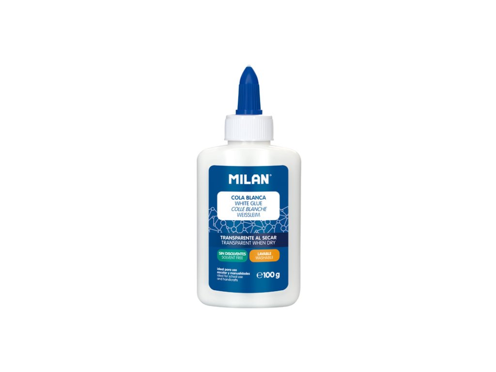 Tekuté biele lepidlo MILAN, po zaschnutí priehľadné.