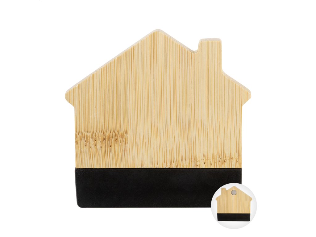 Bambusový magnet na chladničku v tvare domčeka s klipom na poznámky. Slúži aj ako klip na uzatváranie sáčkov.