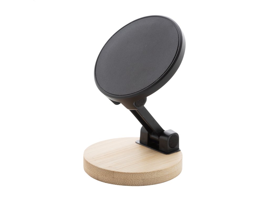Magnetický stolný držiak mobilného telefónu z bambusu a recyklovaného ABS. Vrátane samolepiaceho kovového krúžku na použitie magnetickej funkcie na akomkoľvek zariadení. Kompatibilný s iPhone® 12 alebo novším.Dodatočné parametre