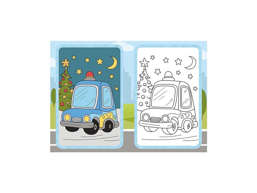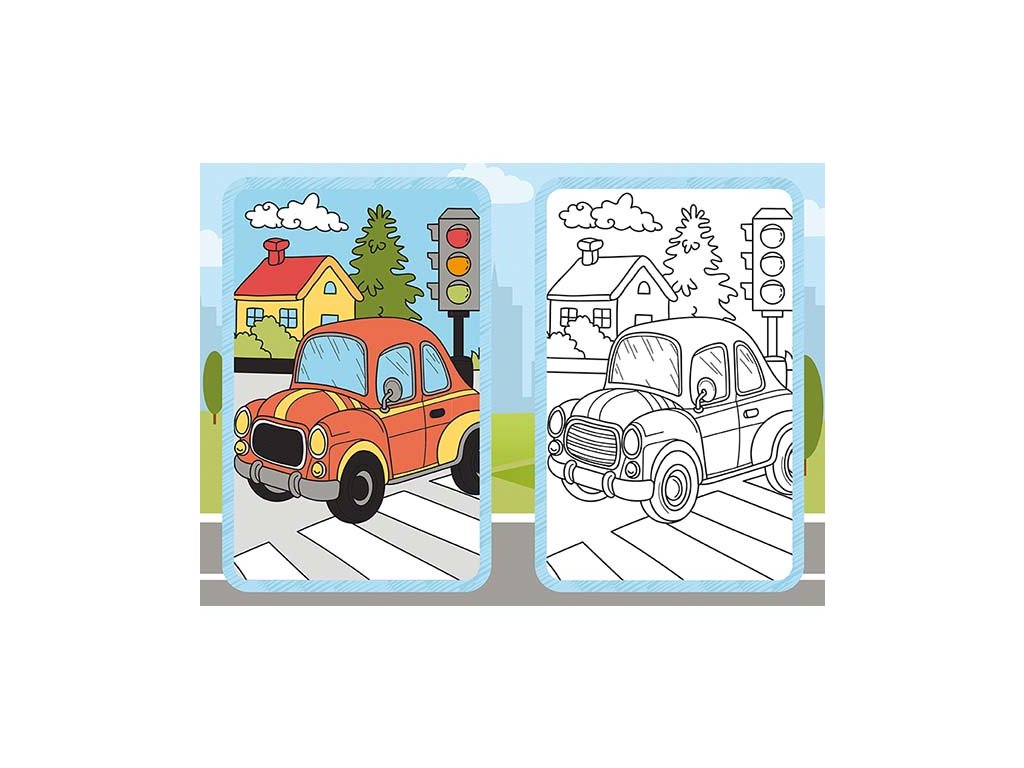Maľovanky obsahujú 9 čiernobielych obrázkov na vyfarbenie a 9 farebných predlôh., dodávaná jednotlivo alebo v balení po 50 ks.