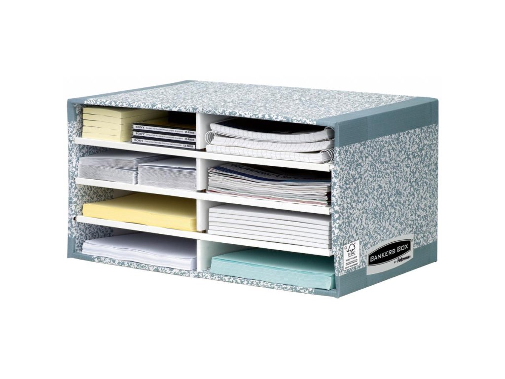 Archívna škatuľa vhodná na triedenie pošty, predajnej literatúry, formulárov a pod. Možnosť označovania priečinkov etiketami. Celkové rozmery (š×v×d) 490×260×310 mm, rozmery priečinka 230×55×310 mm. Dodávaná v rozloženom stave naplocho. Väčšie balenie 5 ks. Farba sivá/-biela.Rozmery v cm: 49x26x31