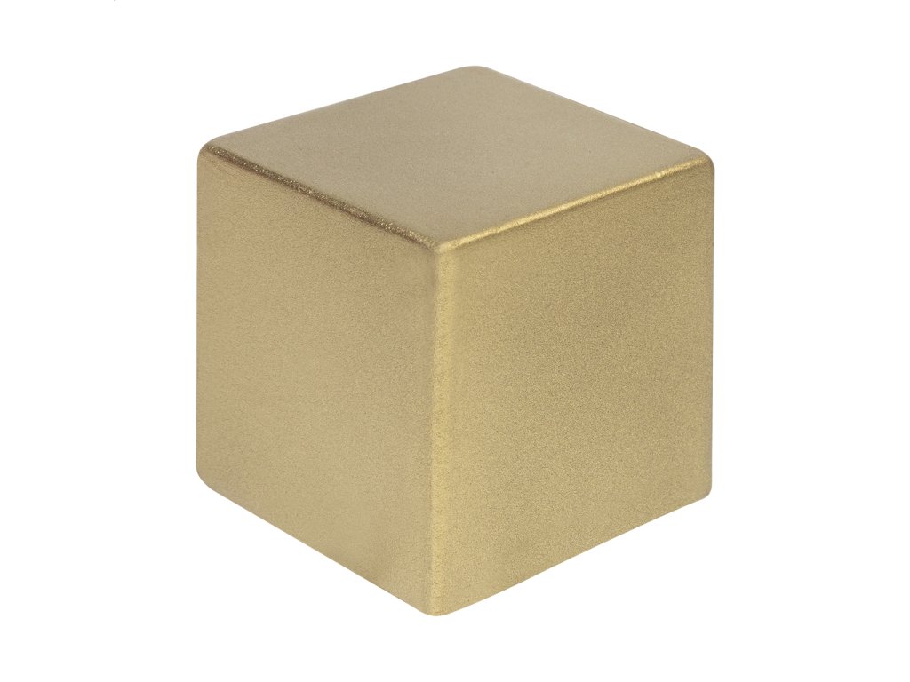 Antistres v tvare kocky z PU peny s metalickým povrchom.
