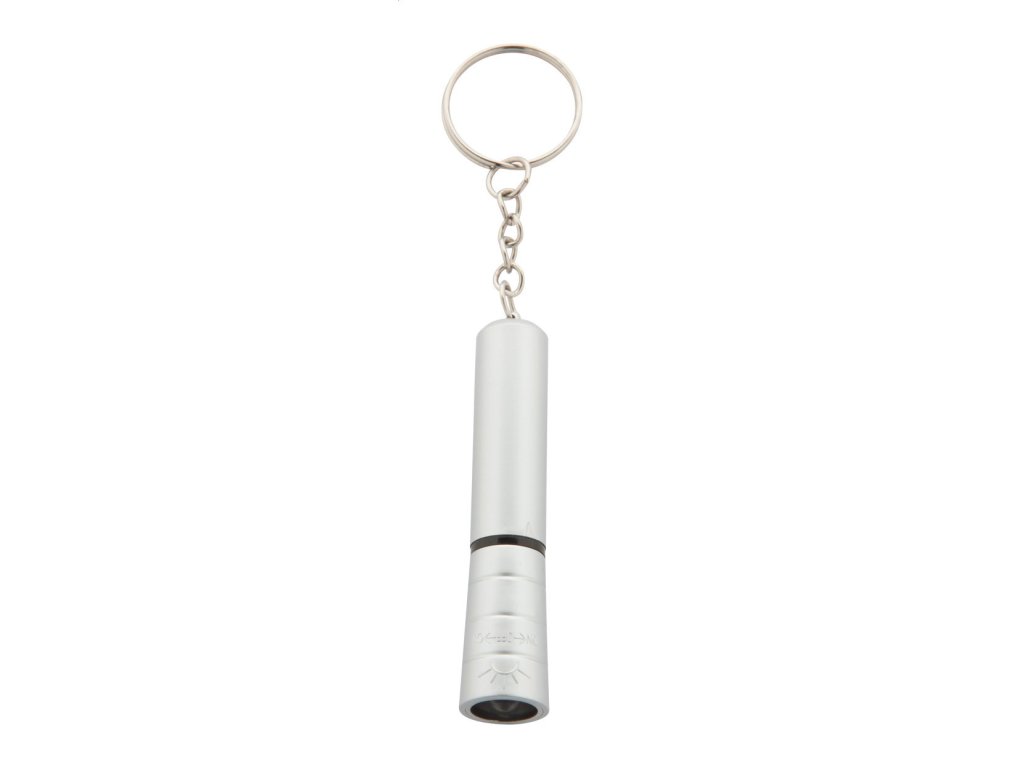 Plastová mini baterka s 1 LED, kovovým povrchom a kovovým krúžkom na kľúče. S gombíkovou batériou.