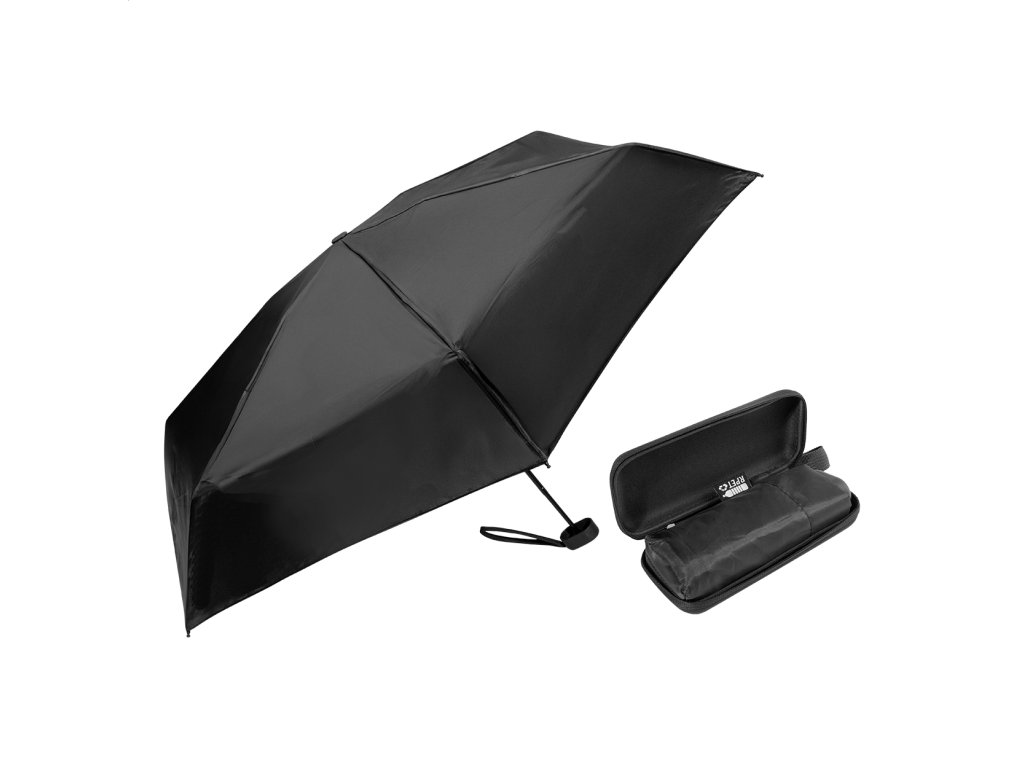 Manuálny, vetruodolný 3-skladací mini dáždnik so 6 panelmi vo farebne zladenom puzdre a tvrdým puzdrom z EVA na zips. S kovovým rámom, rebrami zo sklolaminátu a kompaktnou rukoväťou s pútkom na ruku. 190T RPET pongee s charakteristickým RPET štítkom.Dodatočné parametre